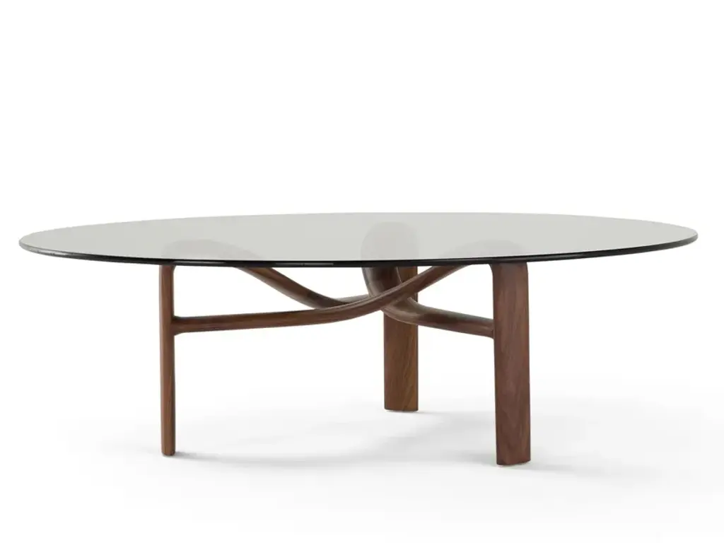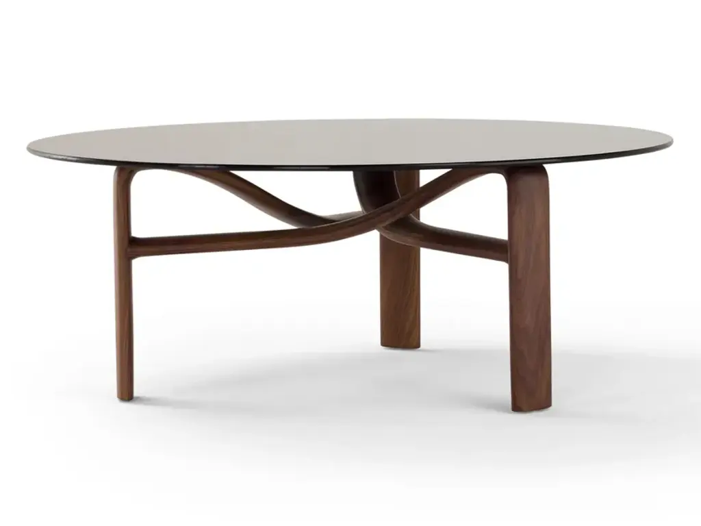 Changing shape according to the prospective. TWISTER is a series of tables with a mutant nature: the sculptural base in massive wood is borne out of an asymmetrical weave of lines that give shape to a solid but dynamic, flexuous but essential. TWISTER as torsion, then, but also as unexpected outcome: that of the three legs of the table which, as branches moved by the wind, tangle and give life to different geometrical shapes according the point of view. To further accentuate the dynamism of the project, there’s the possibility of choosing between dining and coffee tables of different sizes, with round table tops.TOP: glass, marble and woodBASE: wood