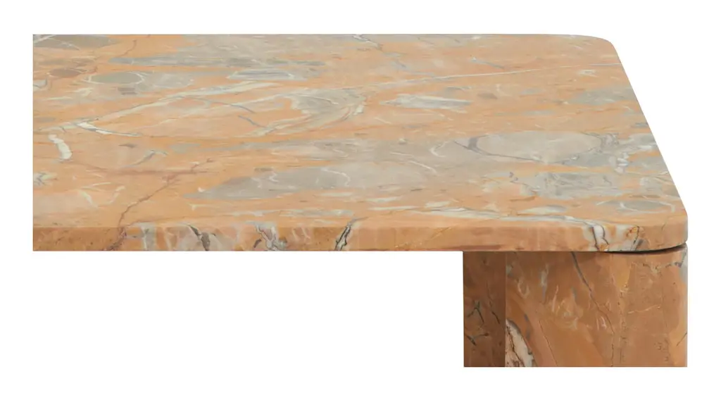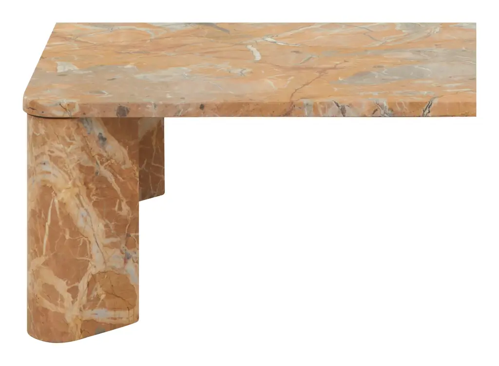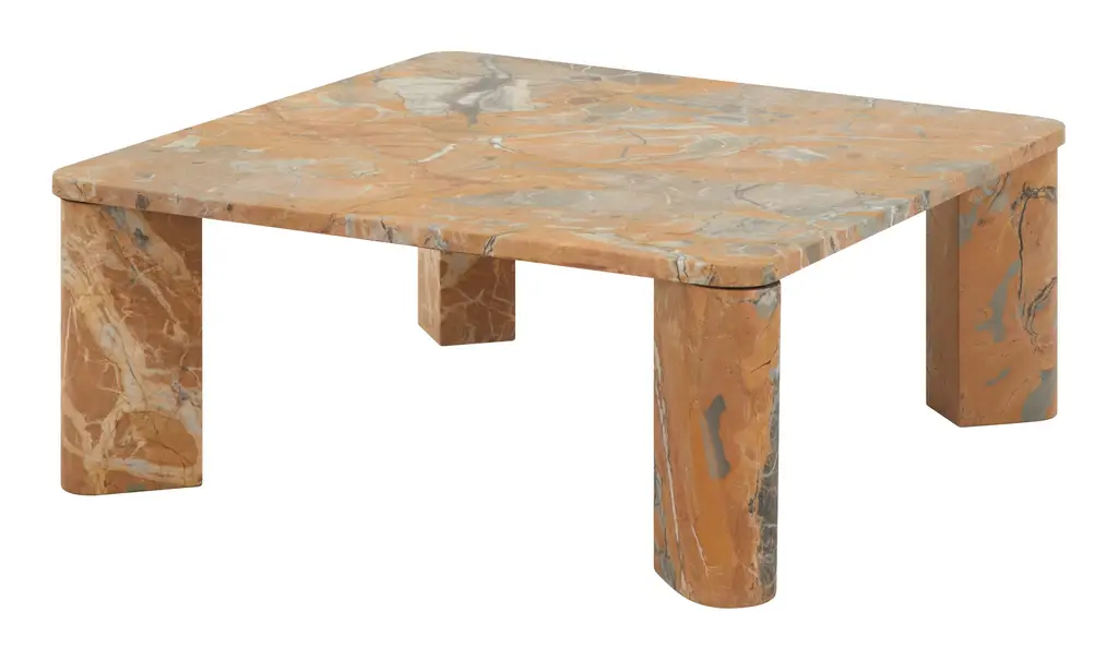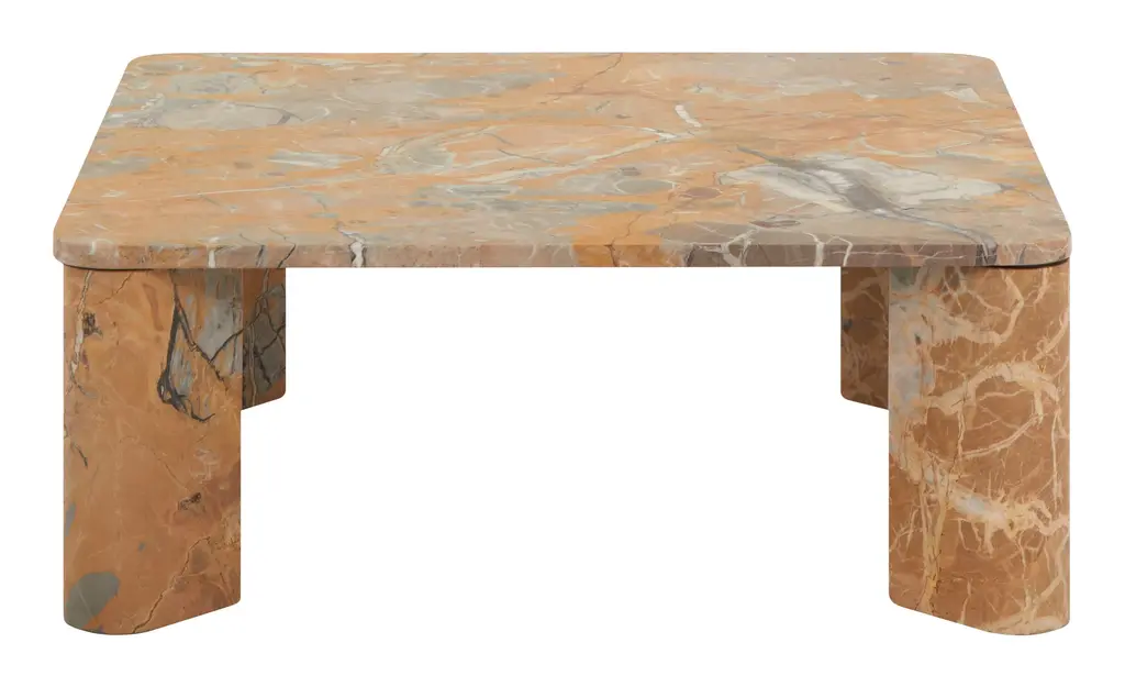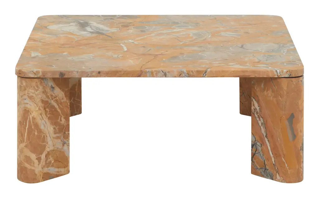 Our Tybalt Coffee Table is sure to stun wherever it goes — and it’s all thanks to the rare beauty of orange levante marble. This breathtaking natural stone is known for its pale orange hue and swirls of rich, organic veining in shades of red, brown, grey, black, cream and white. While this material certainly is luxe, Tybalt definitely feels more fresh than stuffy with its sleek, streamlined shape, rounded corners and chunky, angled legs. All in all, it’s just plain cool — the perfect way to add wow factor to any modern living room. •natural orange lavante marble •assembly required •must be assembled in place; disassemble before moving •each is unique; variations in color and veining of natural stone should be expected Dimensions•35.5"W x 35.5"D x 13.25"H•288 lbs