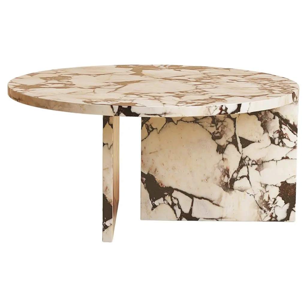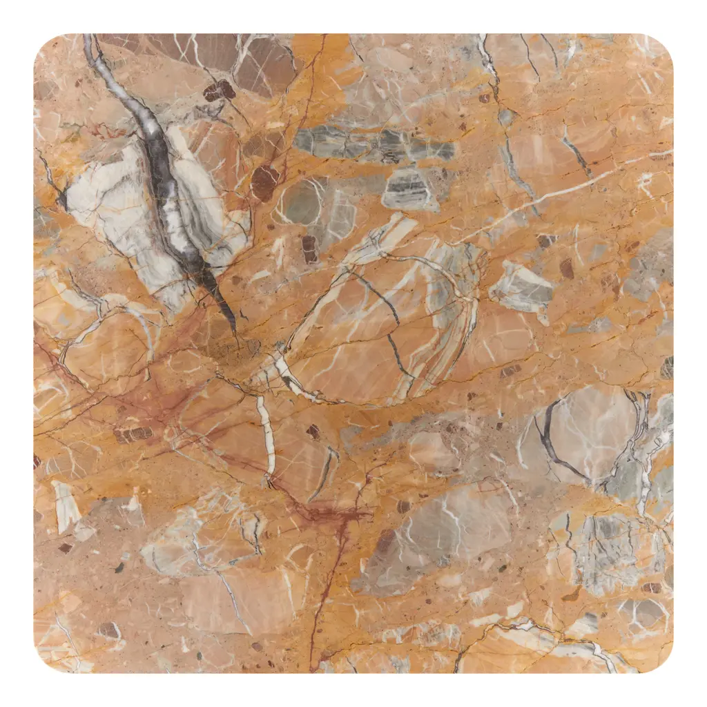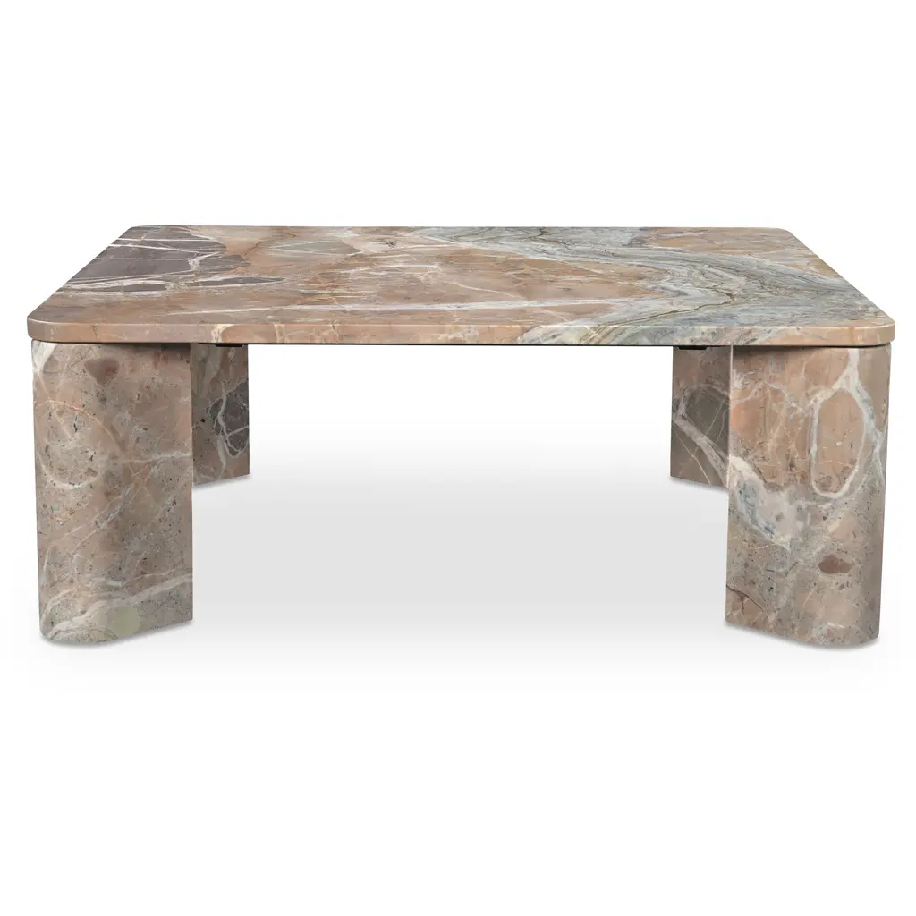 Our Tybalt Coffee Table is sure to stun wherever it goes — and it’s all thanks to the rare beauty of orange levante marble. This breathtaking natural stone is known for its pale orange hue and swirls of rich, organic veining in shades of red, brown, grey, black, cream and white. While this material certainly is luxe, Tybalt definitely feels more fresh than stuffy with its sleek, streamlined shape, rounded corners and chunky, angled legs. All in all, it’s just plain cool — the perfect way to add wow factor to any modern living room. •natural orange lavante marble •assembly required •must be assembled in place; disassemble before moving •each is unique; variations in color and veining of natural stone should be expected Dimensions•35.5"W x 35.5"D x 13.25"H•288 lbs