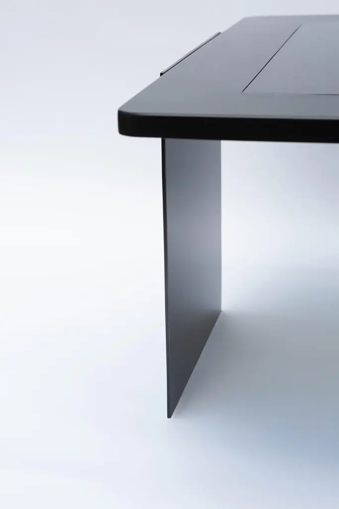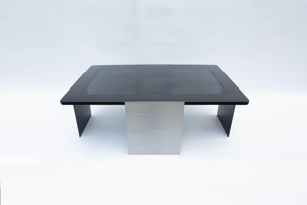 ULTIMO blackened metal coffee table, is composed of two 3/8" thick black metal legs and two 3/8" thick grazed textured satin aluminum on the short ends of the table. The 1/4" thick translucent black glass sits flushed within a 4" wide perimeter top frame.Customization is available, please enquire for additional informationDesigned and hand-crafted by Soraya Osorio.