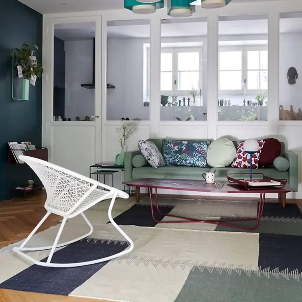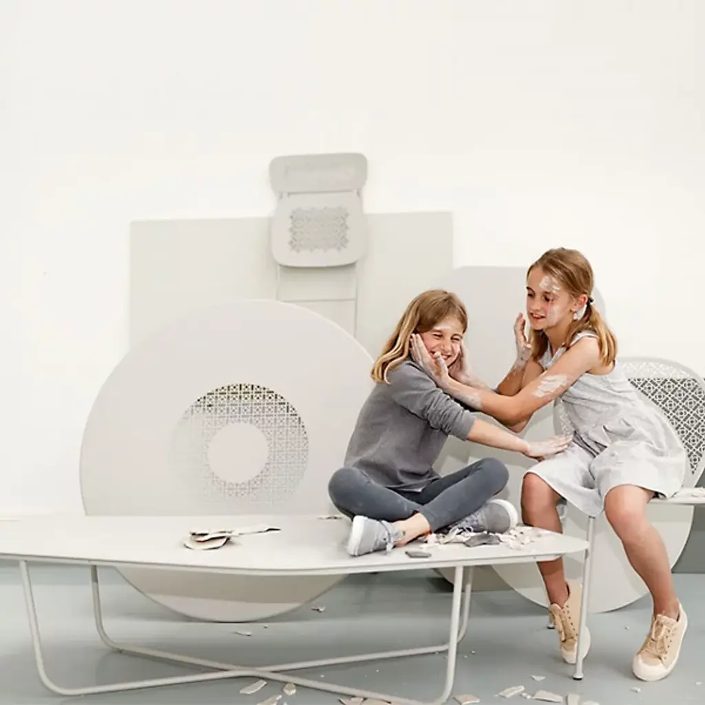 The ideal way to complete your ultimate lounge space. The Ultrasofa Rectangular Low Table by Fermob is a playfully angular and asymmetrical design by Frederic Sofia. It has an expansive surface built to accommodate numerous cocktails, snacks or stretched-out legs. The top is made of lightweight and hard-wearing aluminum sheet, supported by crisscrossing tubes of steel. Use this coffee table as a colorful and geometric centerpiece in modern living spaces all around your home, indoors or out.