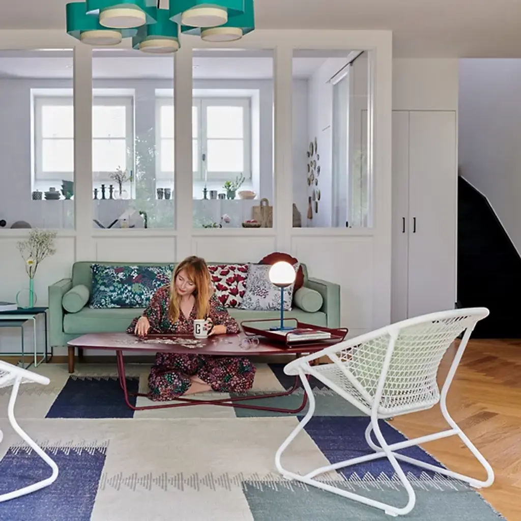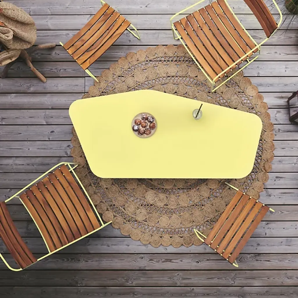 The ideal way to complete your ultimate lounge space. The Ultrasofa Rectangular Low Table by Fermob is a playfully angular and asymmetrical design by Frederic Sofia. It has an expansive surface built to accommodate numerous cocktails, snacks or stretched-out legs. The top is made of lightweight and hard-wearing aluminum sheet, supported by crisscrossing tubes of steel. Use this coffee table as a colorful and geometric centerpiece in modern living spaces all around your home, indoors or out.