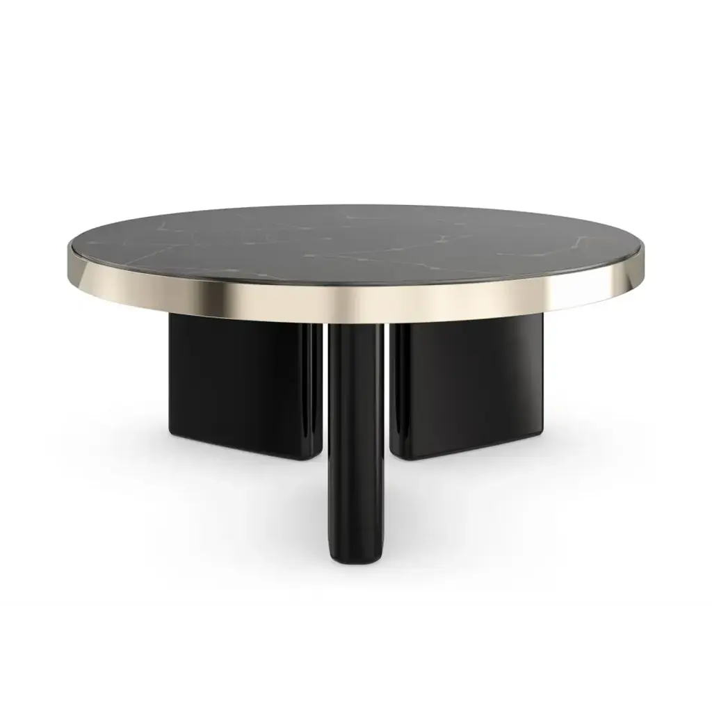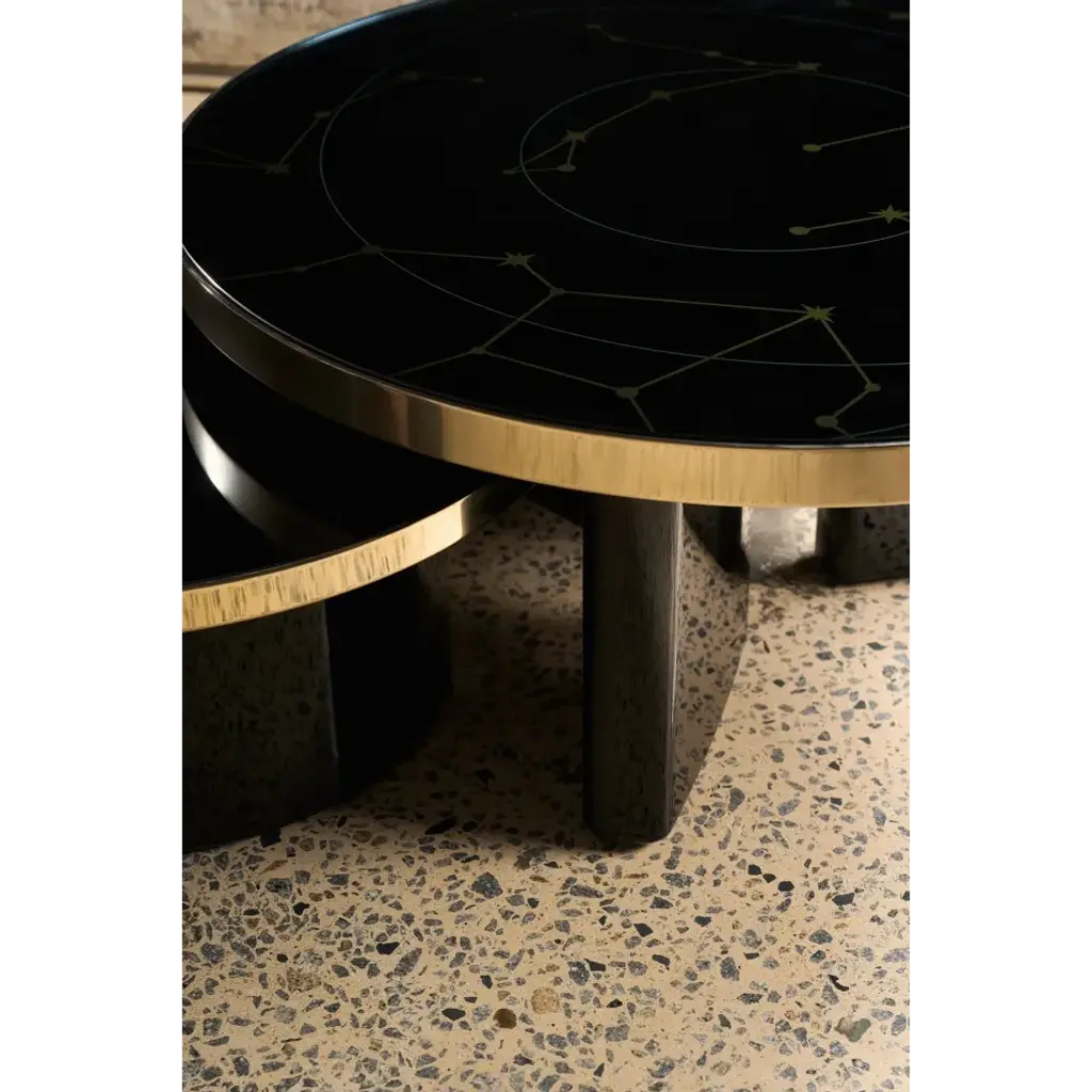 Reflective of the cosmos and the awe it holds, this large cocktail table centers the room and elevates the view. Features a Piano Black top with a constellation silkscreened in Silver Shadow and a Whisper of Gold, with clear glass on top for added reflection and protection. Designed to nest with our small Umbra cocktail and end tables to create a composition with varying shapes and heights.