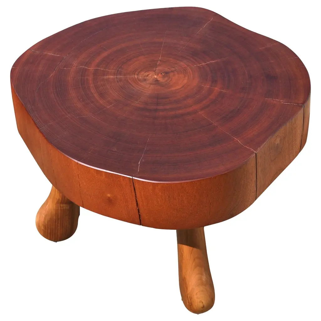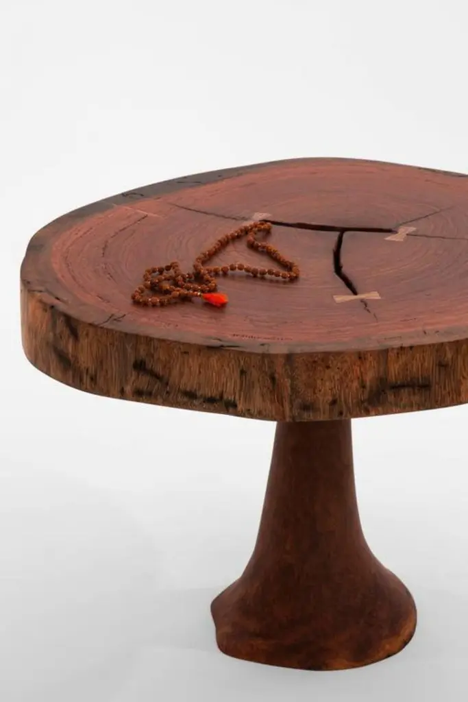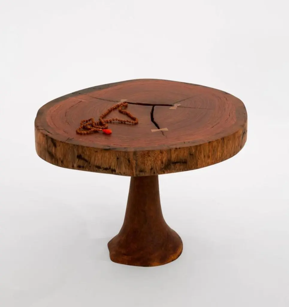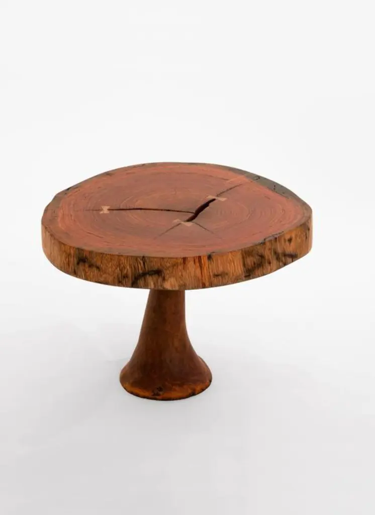 Unique signed table by Jörg PietschmannTable · Ebiara / Australian grass tree, T1104Measures: H 43 x W 58 x D 55 cm tabletop 7 cmRed coloured wood with three butterfly inlays, fixed on a leg of Australian grass tree.Polished oil finish.In Pietschmann’s sculptures, trees that for centuries were part of a landscape and founded in primordial forces tell stories inscribed in the memory of their fibers.The forms Jörg Pietschmann pares from ancient trees are extensive and astonish with their physical presence, a combination of elegance and primeval nature. Pietschmann’s sculptures are monuments to the trees from which they derive.Being endowed with the ruggedness of primeval matter gives them a veritable vitality: figures that appear to have grown into their sculptural form of their own accord. But Pietschmann’s tangibly present bodies have undergone a considerable degree of metamorphosis.In order to generate these unique tree specimens he examines the tree’s morphology and intrinsic inner map until the courses of its grain, of a curve, knots and cracks concur with his projections. The exploratory process is accompanied by constant modification, giving at the start of each new piece no more than an intimation of the figure that will later emerge. In their completion, Pietschmann’s sculptures once more become universal form.Jörg Pietschmann's workshop is situated on the countryside close to Hamburg. He works with indigenous timber as oak, lime tree, beech, poplar, olive tree and maple felled by the wind or human hand, together with tropical timber found on his travels.
