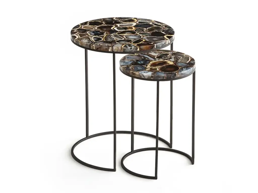 The Unity Round Agate Cocktail Table displays a rounded slab of natural agate stones, resulting in beautiful interplay when paired with a modern, angular cross base adorned with striated patterns. The base boasts a Champagne Gold finish, tastefully blending with the natural white agate to create a gorgeous statement in any space.