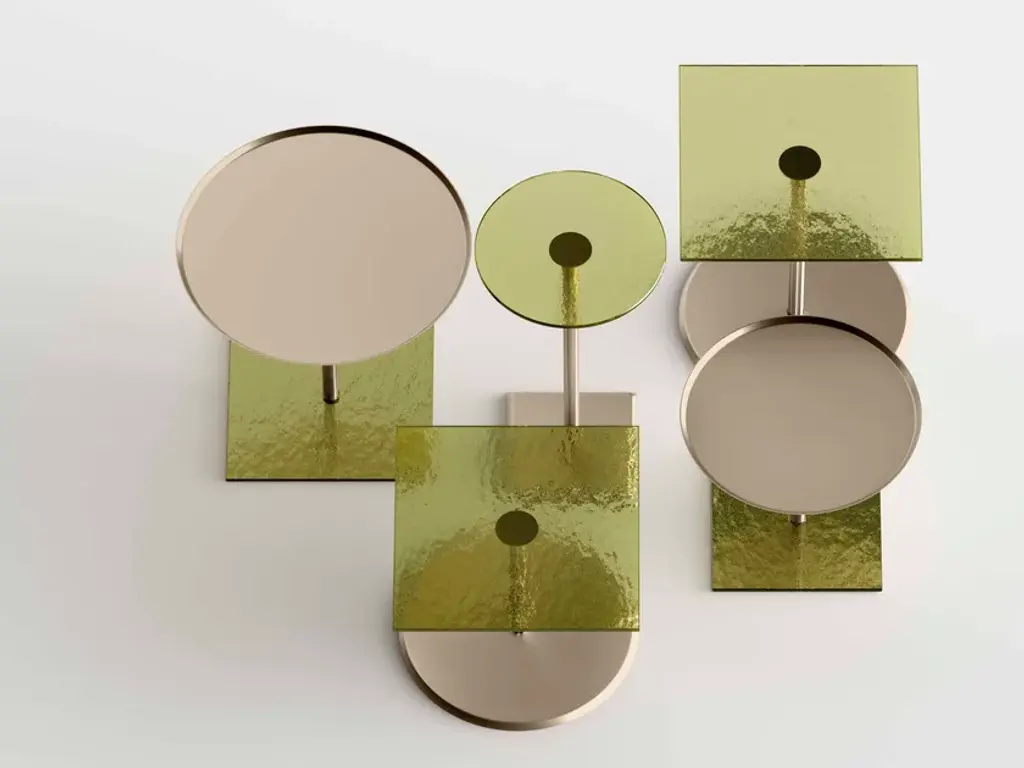 Updown is a collection of side tables with elegant and original metal frame. Several dimensions and heights are available with tops and bases in round or square shape that can be made of fused glass or metal. The aesthetic variety allows to place them, on their own or in groups, in several environments of the house. The primitive shapes of base and top enhance the central stem’s metal detail, meticulously turned in its thickness and refined on the surface.