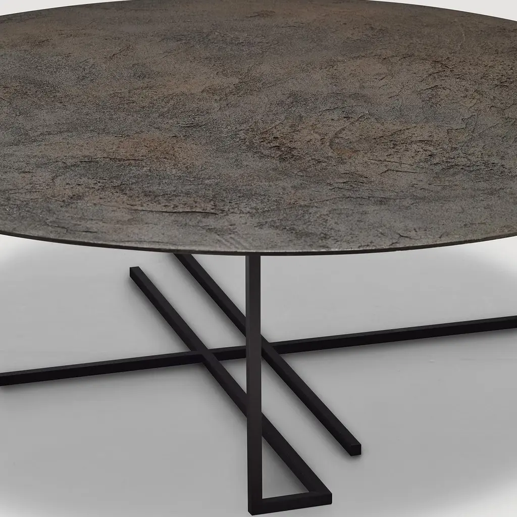 Stunning in its simplicity, this indoor-outdoor coffee table is composed of strikingly shaped legs and frame crafted of welded steel supporting a sleek steel top with a unique textural finish.