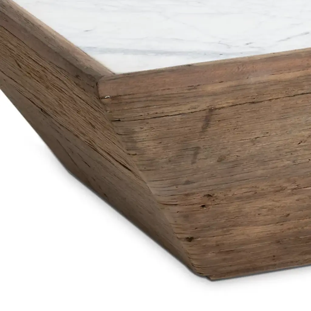The Vale Coffee Table from Regina Andrew features an unusual inverted pyramid base made from reclaimed wood that supports a marble top. The angled wooden sides create interesting shadows and give this coffee table a sculptural presence in any room. Reclaimed wood brings authentic texture and history, with each piece showing unique grain patterns and weathering; the marble surface provides a smooth, cool contrast to the warm wood base, offering practical space for drinks and books. This combination of materials creates a piece that feels both rustic and polished.