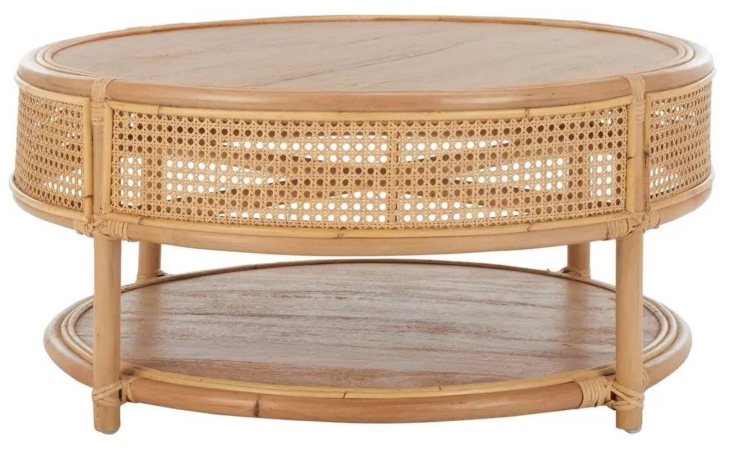 Refresh your space with the warm and breezy presence of our Varinity Coffee Table. The modern and airy profile of our two-tiered table is updated with rich textures of rattan. The round coffee table is surrounded by a breezy mesh and stands upon rattan poles to attain a charming and inviting presence. The tabletop and a shelf underneath showcase a richly textured surface to elevate your favorite decor. Both practical and charming, our coffee table creates an inviting spot to gather around in your living space and bedroom.