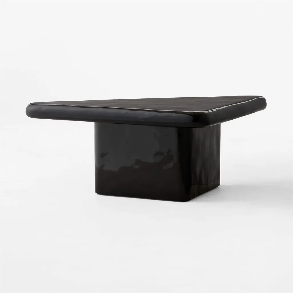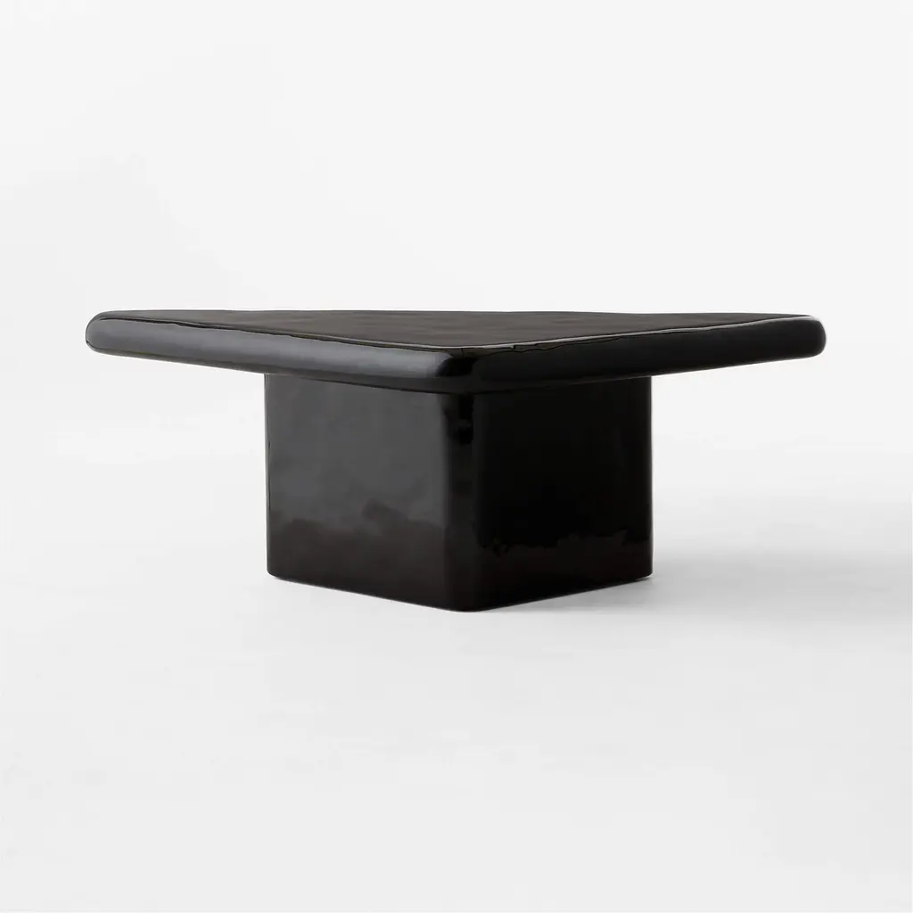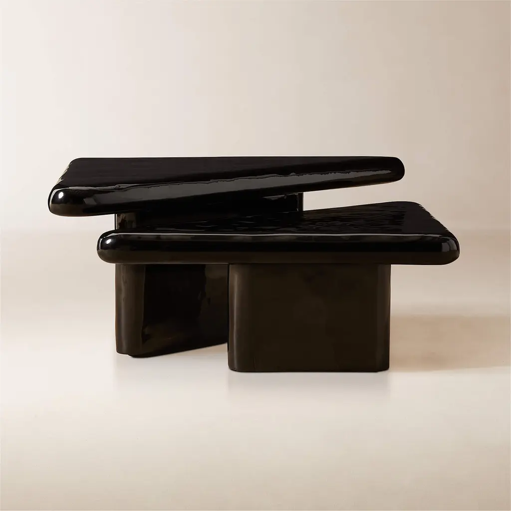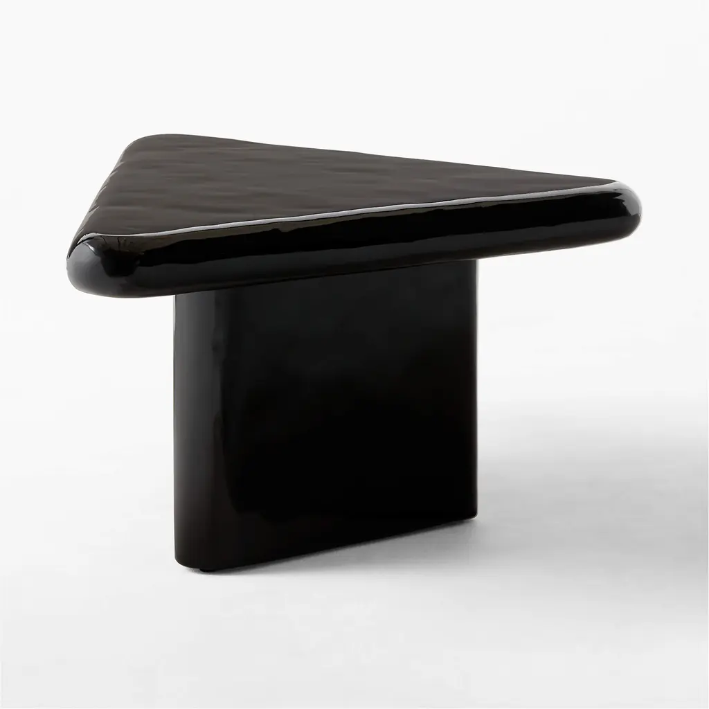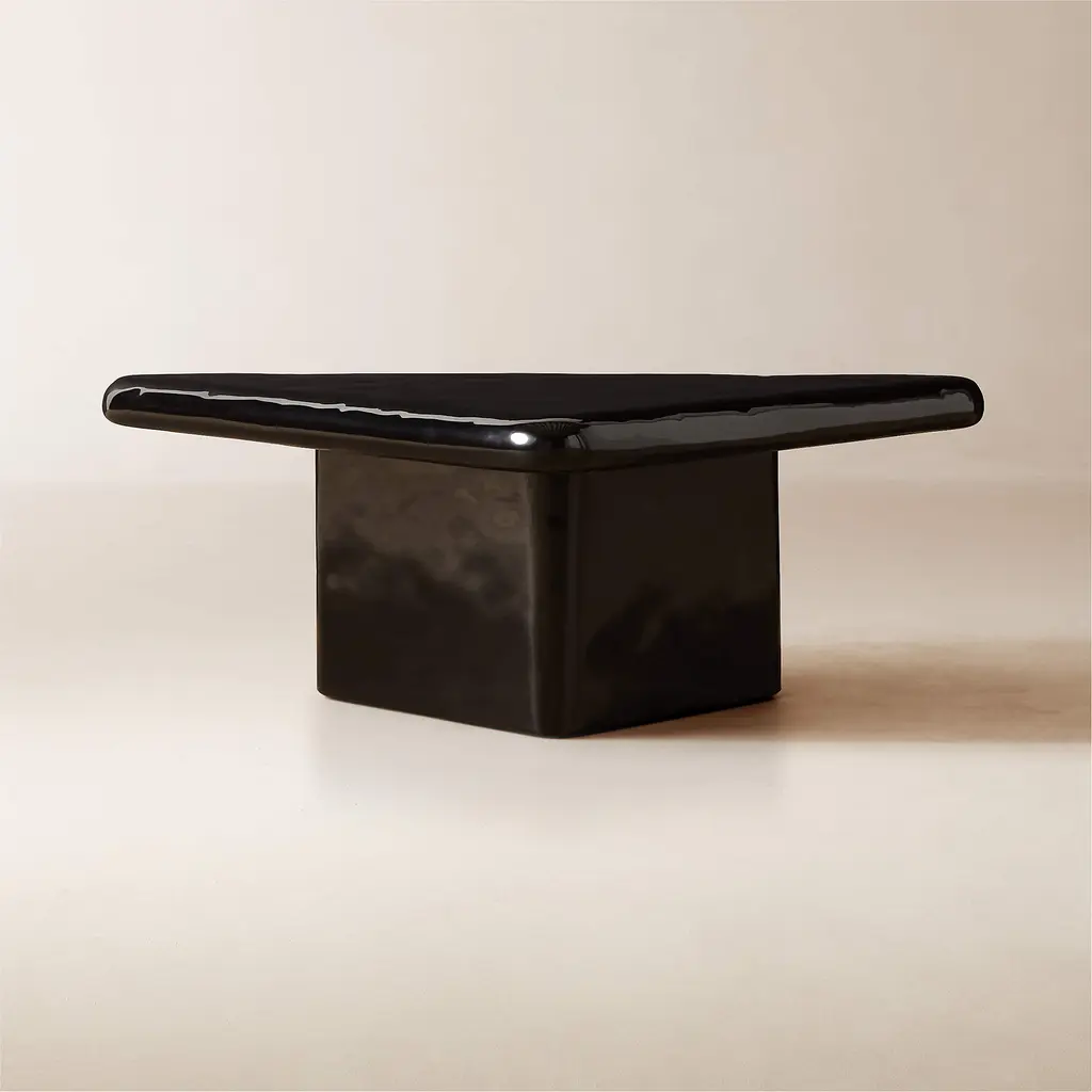 Bold proportions and alluring surface patterns define the Vayle Coffee Table. Covered in an undulating high-gloss black finish, concrete triangular tops and curved edges are reminiscent of 1970s streamlined opulence. Triangular pedestal bases echo the strong geometry of the tops. Designed by Melbourne-based VUUE, short and tall can be nestled together in a tiered square or shifted for distinct angles. Each table will have a unique, wavy surface due to variations in the natural material. CB2 exclusive.