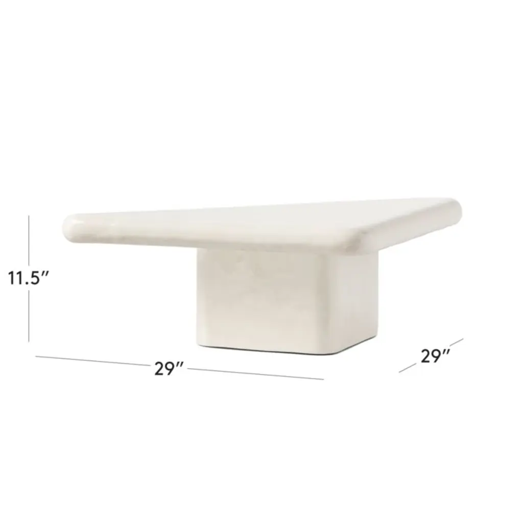 Bold proportions and alluring surface patterns define the Vayle Coffee Table. Covered in an undulating high-gloss white finish, concrete triangular tops and curved edges are reminiscent of 1970s streamlined opulence. Triangular pedestal bases echo the strong geometry of the tops. Designed by VUUE, short and tall duo can be nestled together in a tiered square or shifted for distinct angles. Each table will have a unique, wavy surface due to variations in the natural material. CB2 exclusive.
