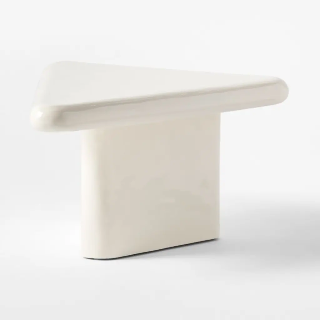 Bold proportions and alluring surface patterns define the Vayle Coffee Table. Covered in an undulating high-gloss white finish, concrete triangular tops and curved edges are reminiscent of 1970s streamlined opulence. Triangular pedestal bases echo the strong geometry of the tops. Designed by VUUE, short and tall duo can be nestled together in a tiered square or shifted for distinct angles. Each table will have a unique, wavy surface due to variations in the natural material. CB2 exclusive.