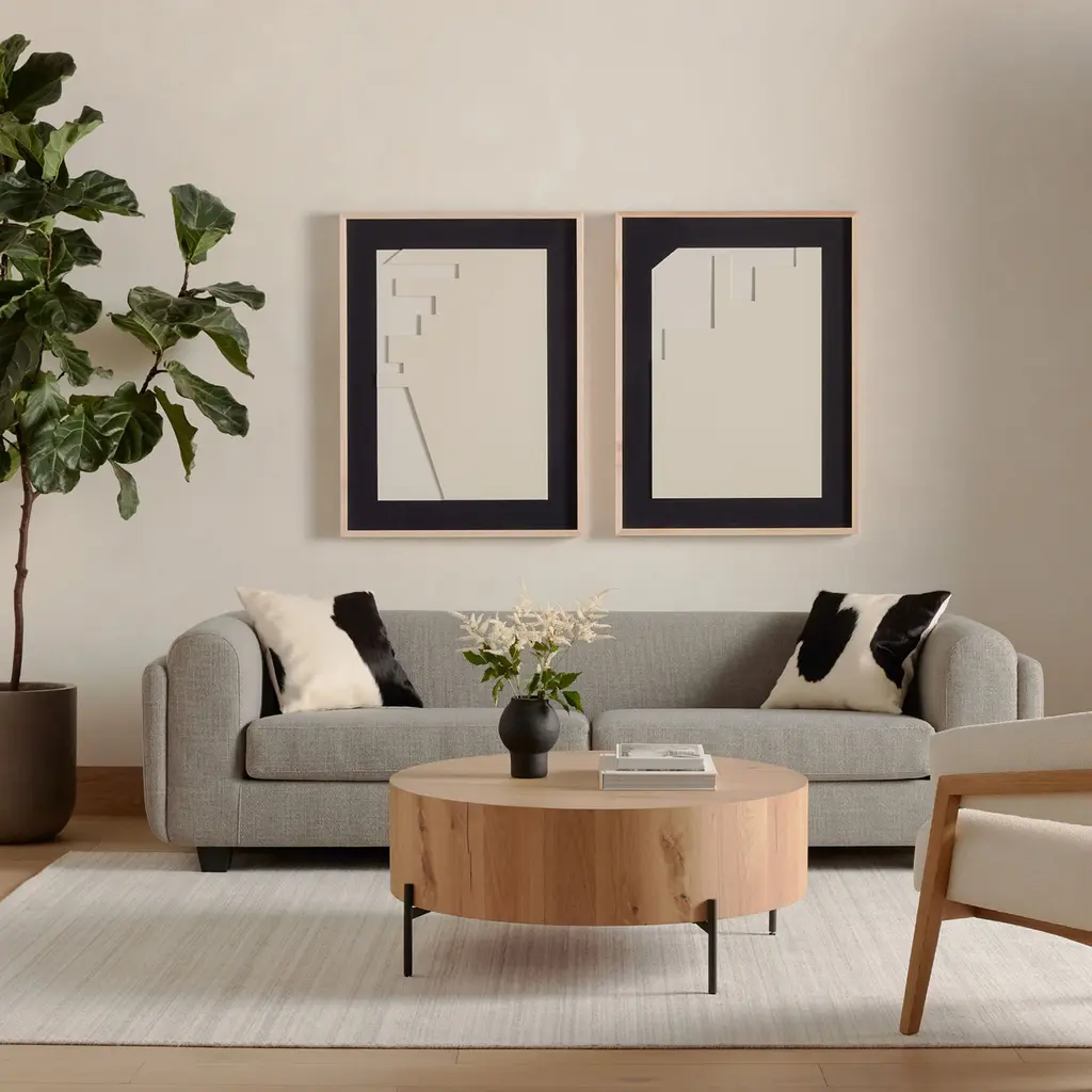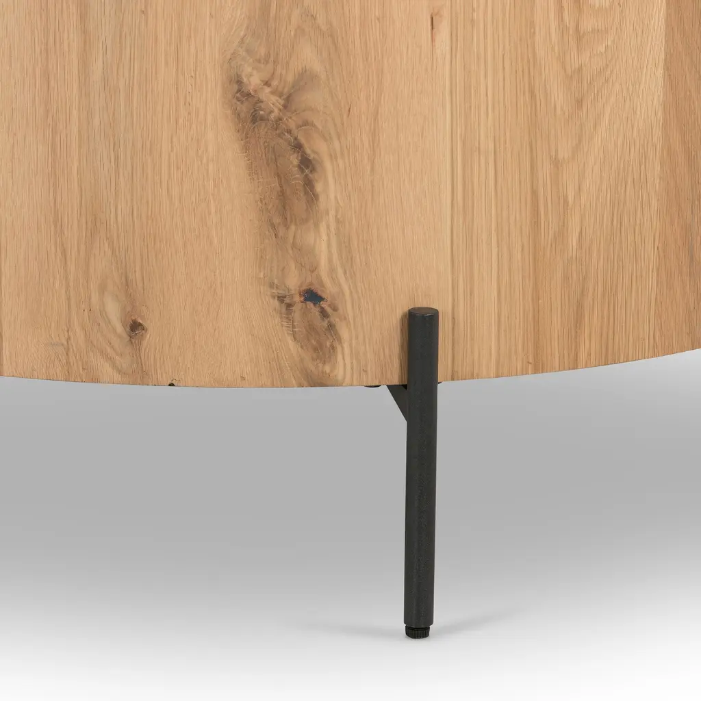 Sleek iron legs support the oversized drum body. Rich oak veneer adds warmth to your living space. Wood is kiln-dried for extra durability.