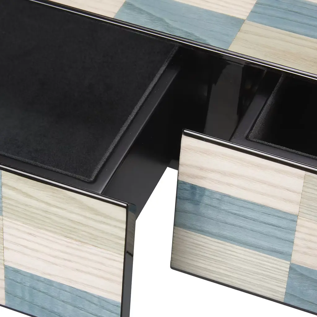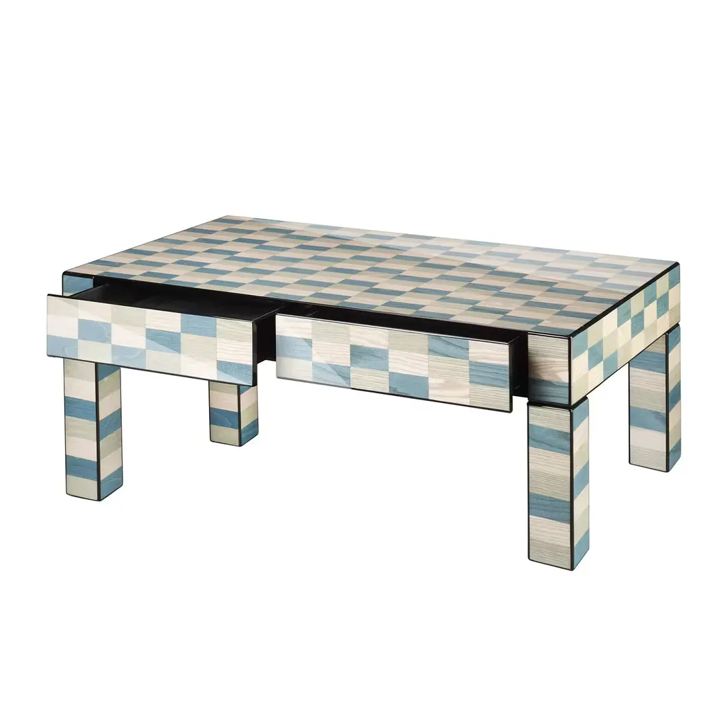 The Venezia Laguna coffee table is a contemporary art piece that seamlessly blends functionality with striking design. Crafted entirely in wood, this piece features an intricately designed inlay composed of a captivating array of colored rectangles, polished and brushed for a bold finishing touch. Designed for both residential and commercial spaces, it adds vibrancy and charm to any environment. Equipped with two spacious drawers lined with black Alcantara, it offers practical storage solutions without compromising on style. Available in several stylish versions and utilizing premium materials, this Coffee Table is a testament to skilled craftsmanship.