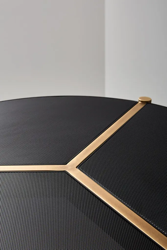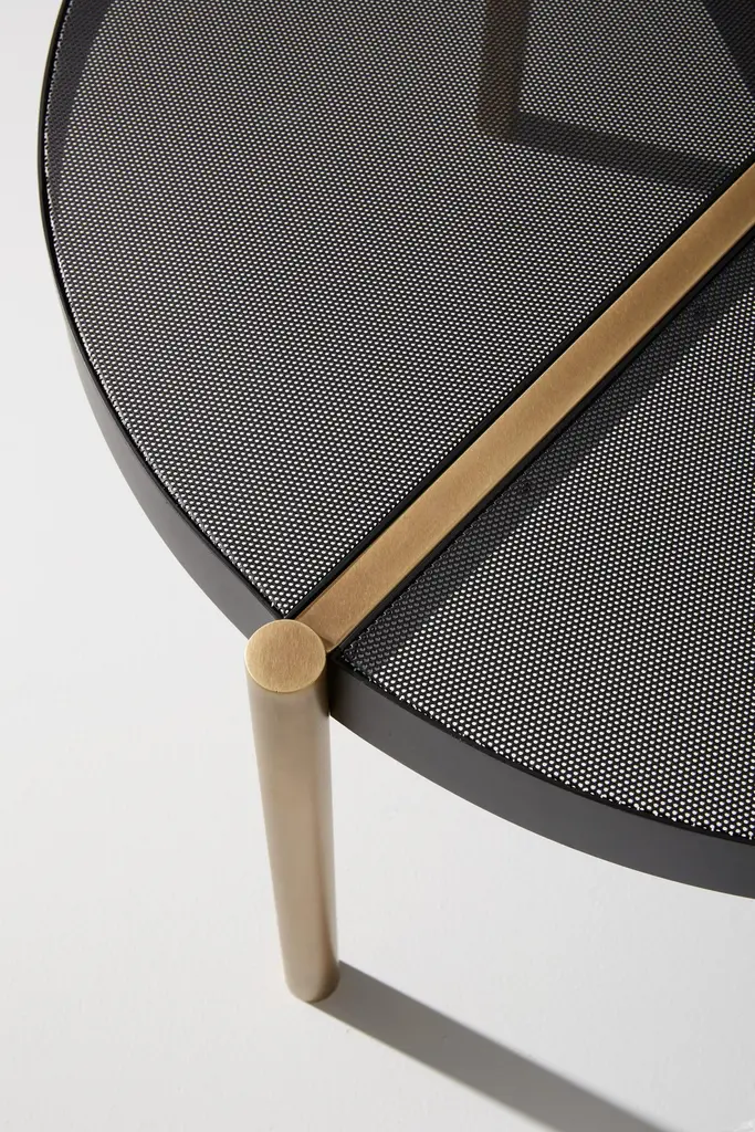 Coffee table composed of light burnished brass structure and matte black perforated metal top.