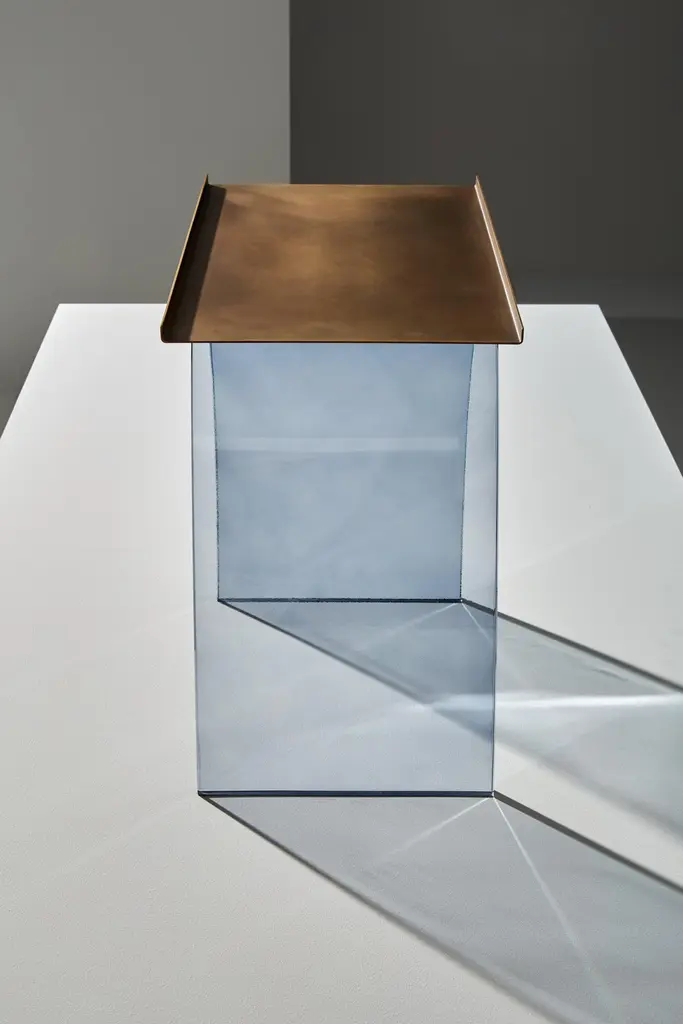 Coffee table composed of curved smoke grey glass bearing structure. Light burnished brass top.