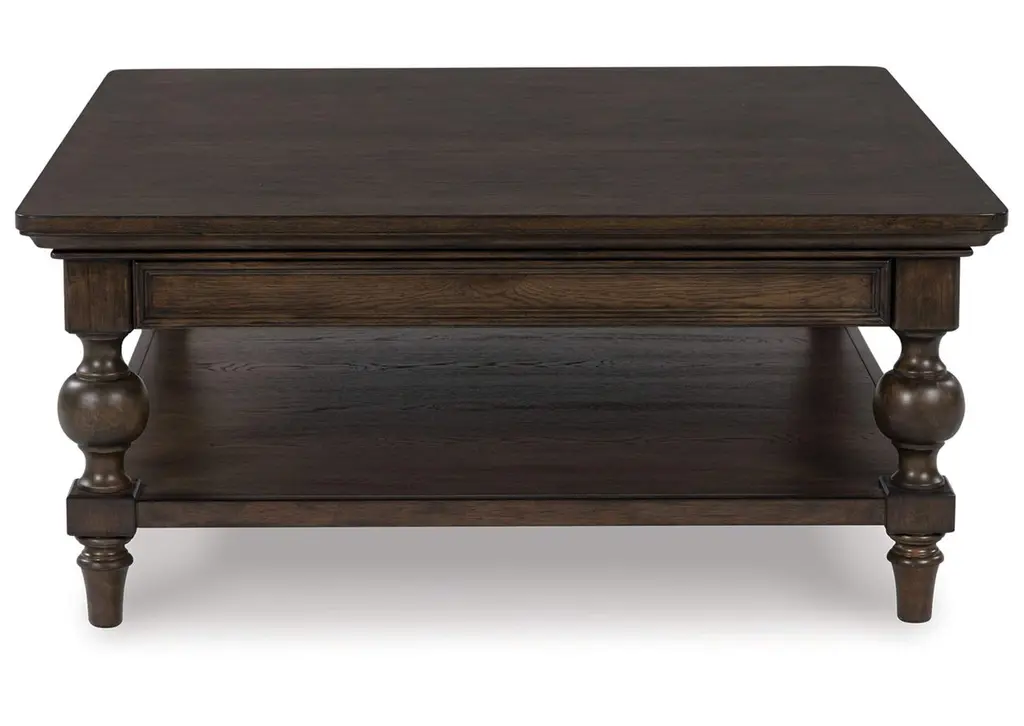 For those who appreciate a time-honored aesthetic with understated elegance, the Veramond coffee table brings home a timeless look. Its rich brown walnut finish merges seamlessly with a profiled top and traditional baluster turned legs for a richly classic appeal. And did we mention the spacious lower shelf to display your whatnots? Weight 113.000 lbs. (50.85kgs.)
