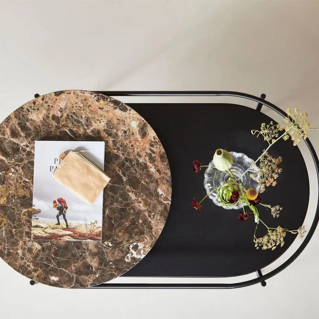 The elegant lines from the verde mirror has been transferred into a coffee table. The oval-shaped metal construction is designed with two table tops. the lower in black painted oak veneer and the circular top in either black or brown marble or white terrazzo. The space created between the two table tops is ideal for flowers and plants, which has been the central idea for designer Rikke frost when drawing the lines for the verde series. Verde allows you to get closer to nature and create space for a green environment inside your home.
