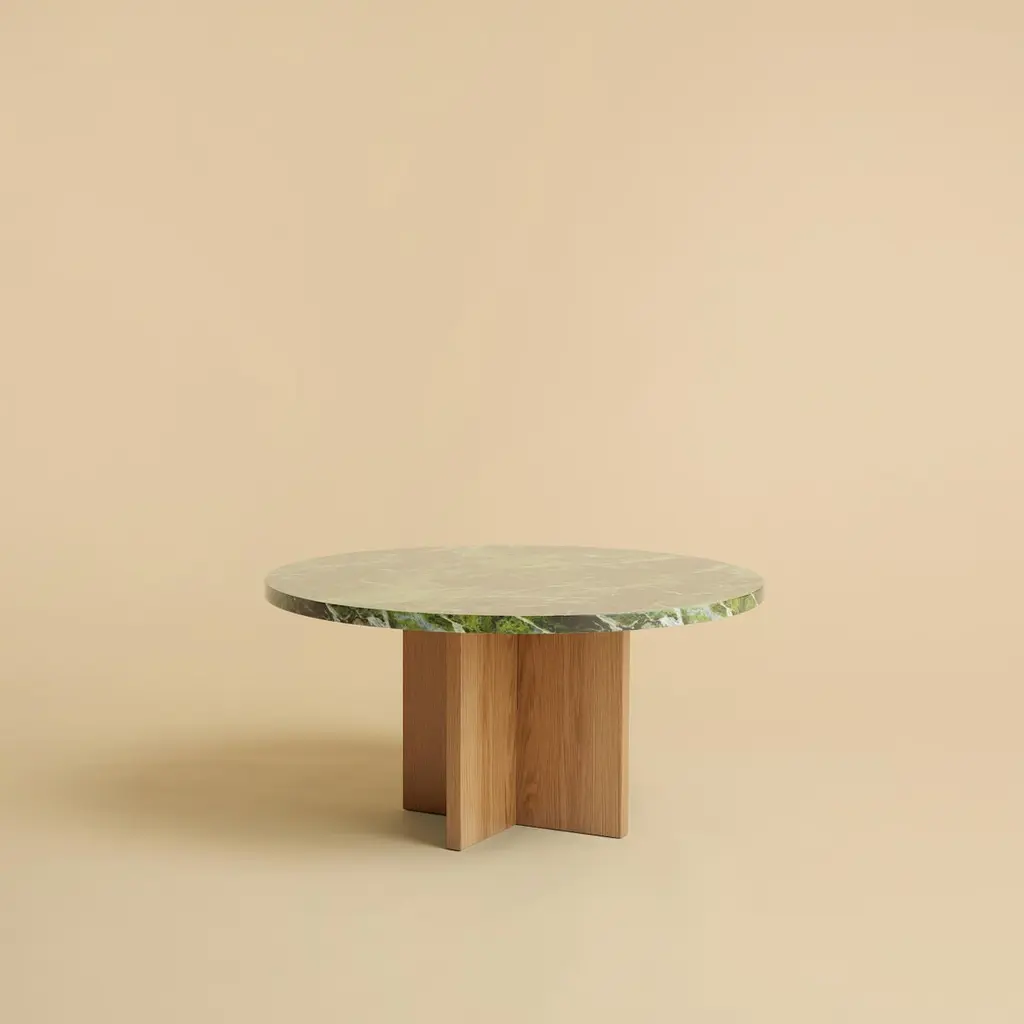 The Tinian coffee table is produced with an oak wood base and Verde Tifone marble top. The top is circular and 60cm in diameter, while the base is obtained by gluing oak planks perpendicular to each other.Artisanal production made of technological innovation andan old-fashioned expertise where marble and wood are carefully finished manually to preserve and highlight their nature and preciousness of their history. Designed to be placed in indoor in premium livings for the classic tone-on-tone effect, or in light environments where the contrast with the context stands out. A contemporary and minimal style is the one that goes perfectly with these elements and accentuates its class, value and elegance.The piece is designed by Lebanto and is 100% Made in Italy in small familiar workshop. Attention to details and superior material is what distinguish Lebanto products.