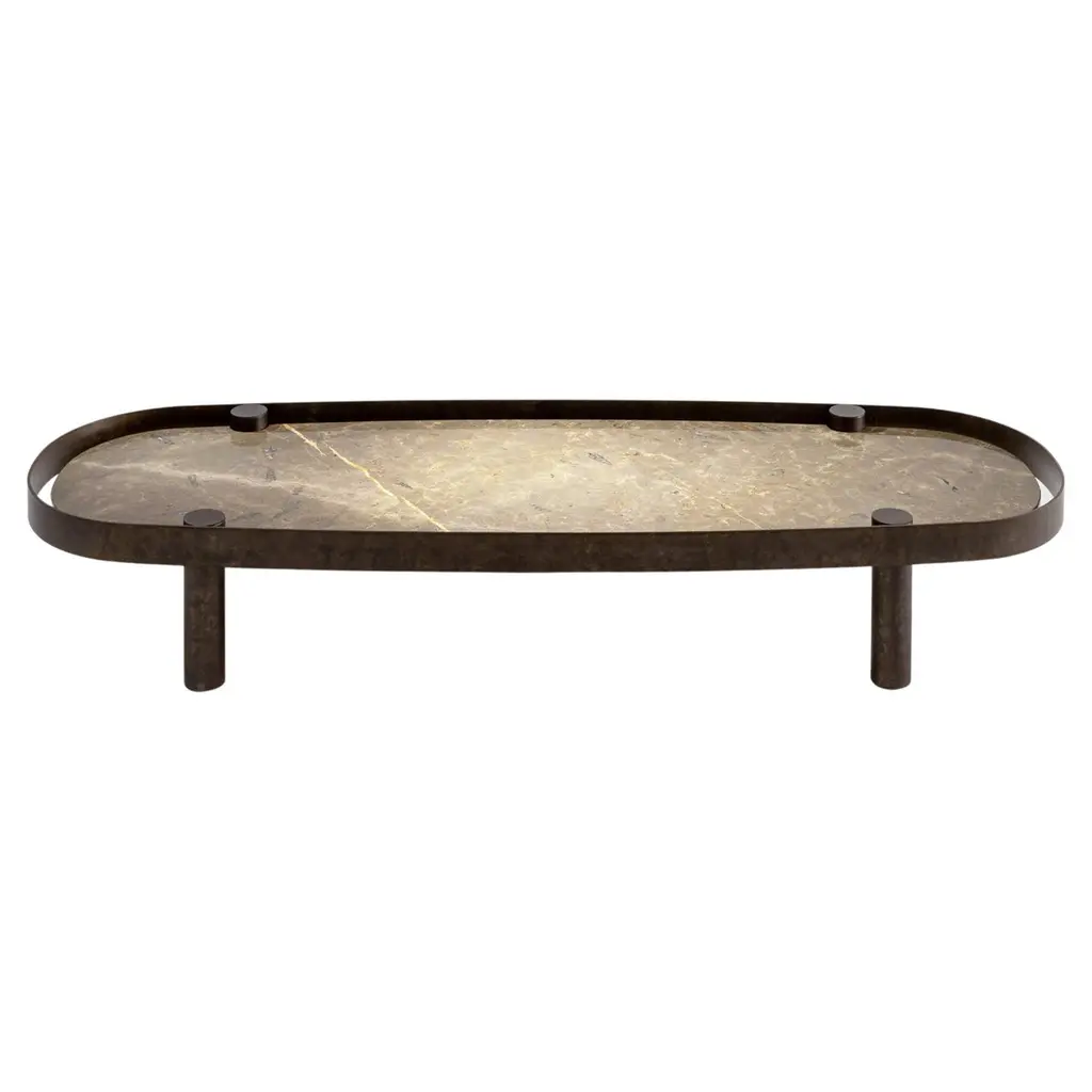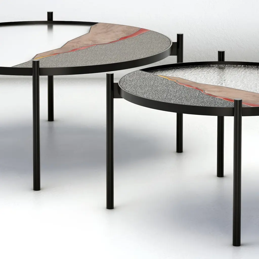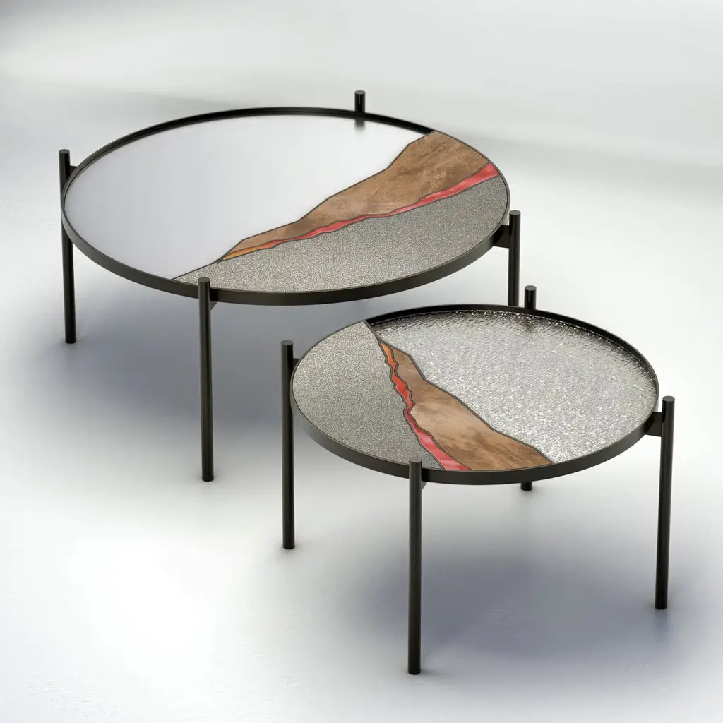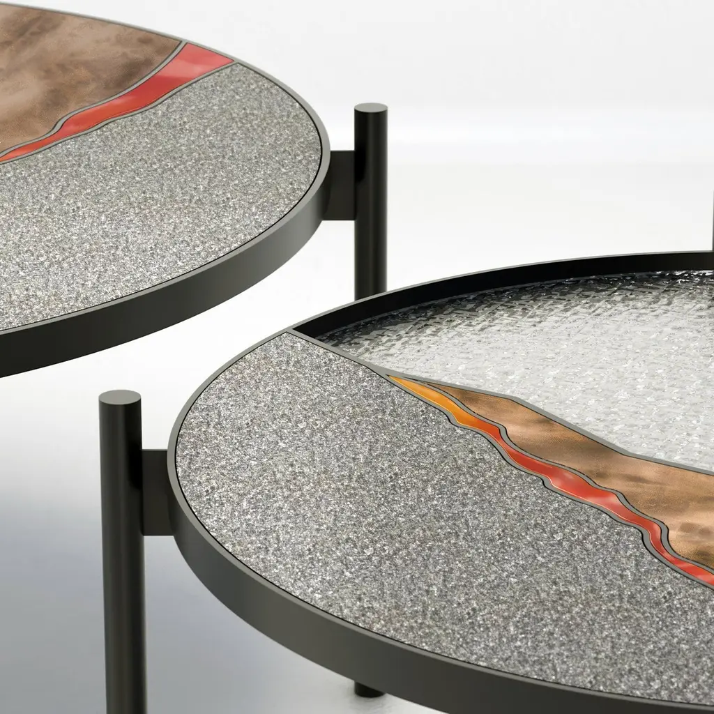 Vesuvius Big Coffee Table by Atlas ProjectDimensions: Ø 85 x H 38 cm. Materials: Black powder painted iron, stainless steel mirror, lava stone, glass fusion handpainted, and copper.Available in two different sizes. Please contact us.Our ProjectThe synergy between a thirty-year Italian craft experience and an original design, based on the need to research and develop topics up with the new aesthetic trends, gives birth to Atlasproject, an exclusive furniture collection conceived by the designer Massimiliano Giordano.Born and developed first in Copenhagen, then in Vienna and finally in Rome, the project is – as a matter of fact - a journey of contamination and encounter between the many cultures of the European Design.The production is focused on a dynamic dialogue between geometries and materials, which leads to collections of deep impact and elegance. Every piece merges essential geometric shapes with the most surprising materials, textures, and colors, as the result of a careful selection of natural materials and hand-processed metals.The Atlasproject collections are entirely made in Italy, where the tradition of artisanality is still a deep value, to ensure high-quality and long-life products.Of Neapolitan origins, Massimiliano Giordano grew up inthe family’s artistic atelier.The artisan knowledge and the design skills lead him to Atlasproject, a creative container inspired by the journey, leit motiv of his personal and professional life. In fact, the designer leaves from Naples towards Copenhagen, where he will stay for five years, and then for Vienna for five years more in the heart of the Mitteleuropean design, and finally in Rome, where he currently lives and works.The amazing connections between the encountered design souls actually represent the most significant stylistic figure of his works.