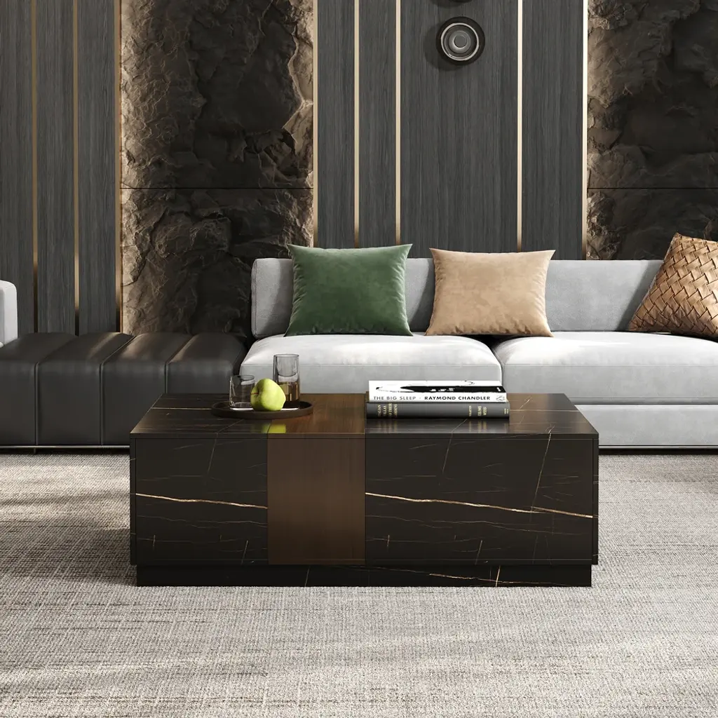 The coffee table is constructed from pure white marble veneer and walnut wood veneer finish and incorporates aesthetically visible grain details. It includes 2 spacious drawers and stores a wide range of DVDs, video games, remote control units, and so on. From enjoying snacks and coffee to offering spacious storage, it fits any space.
