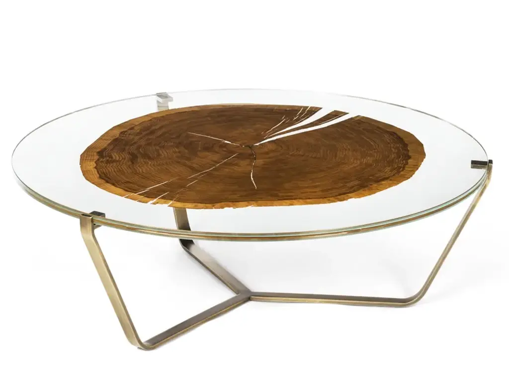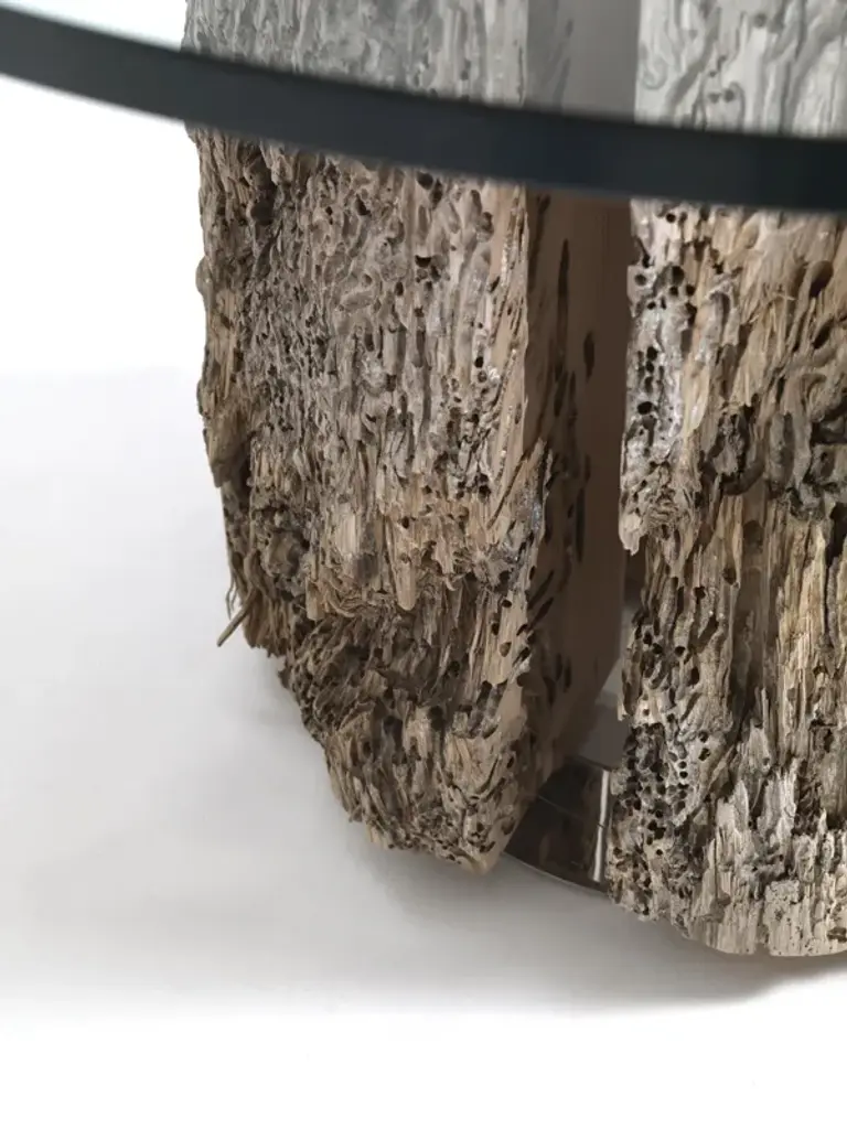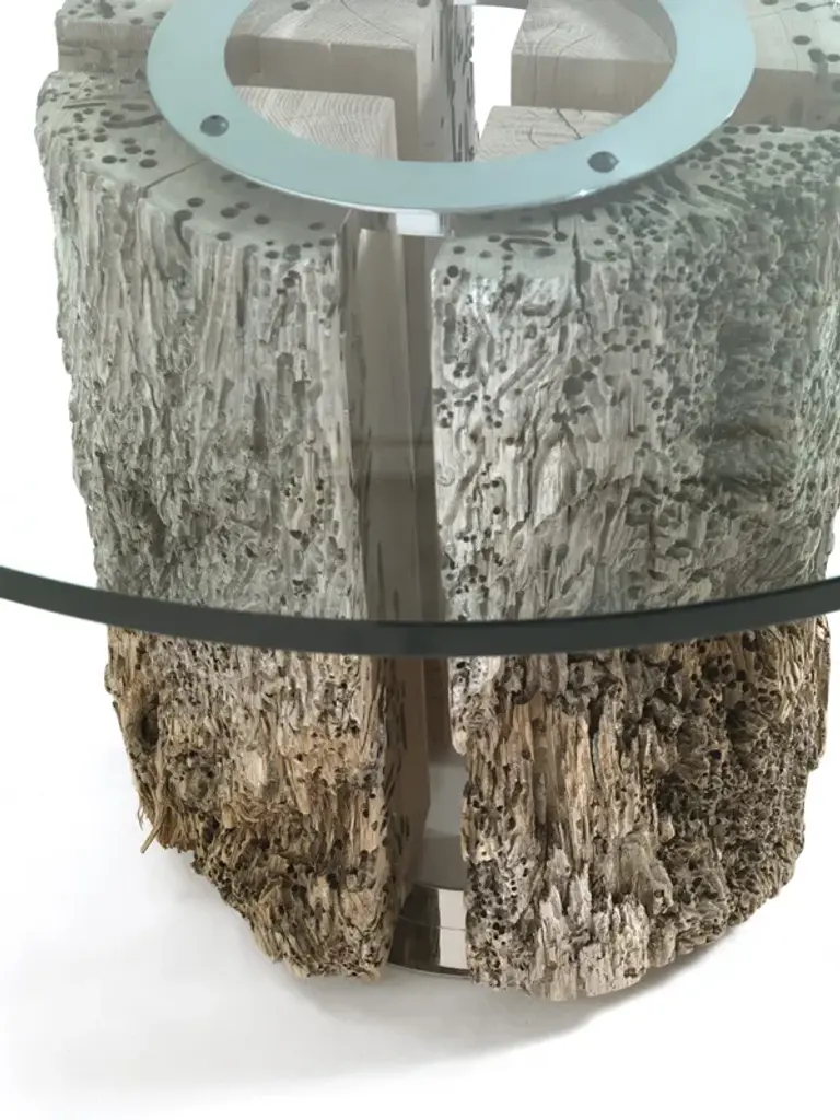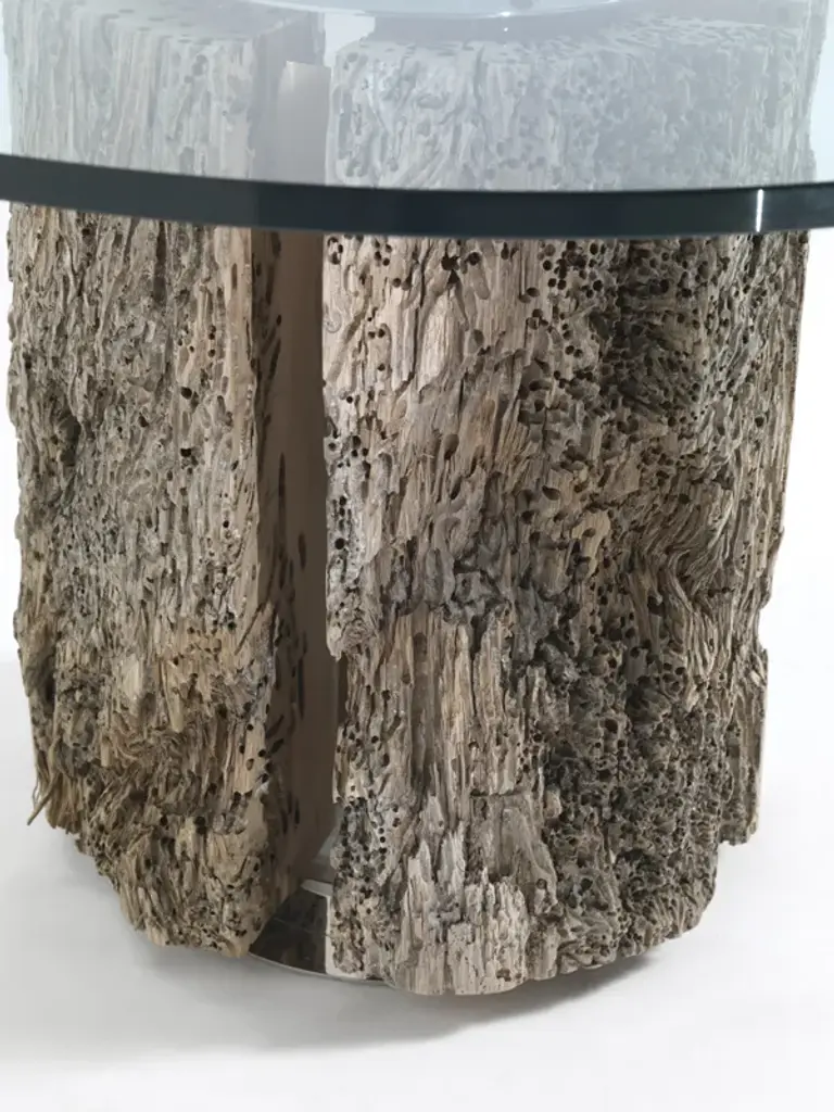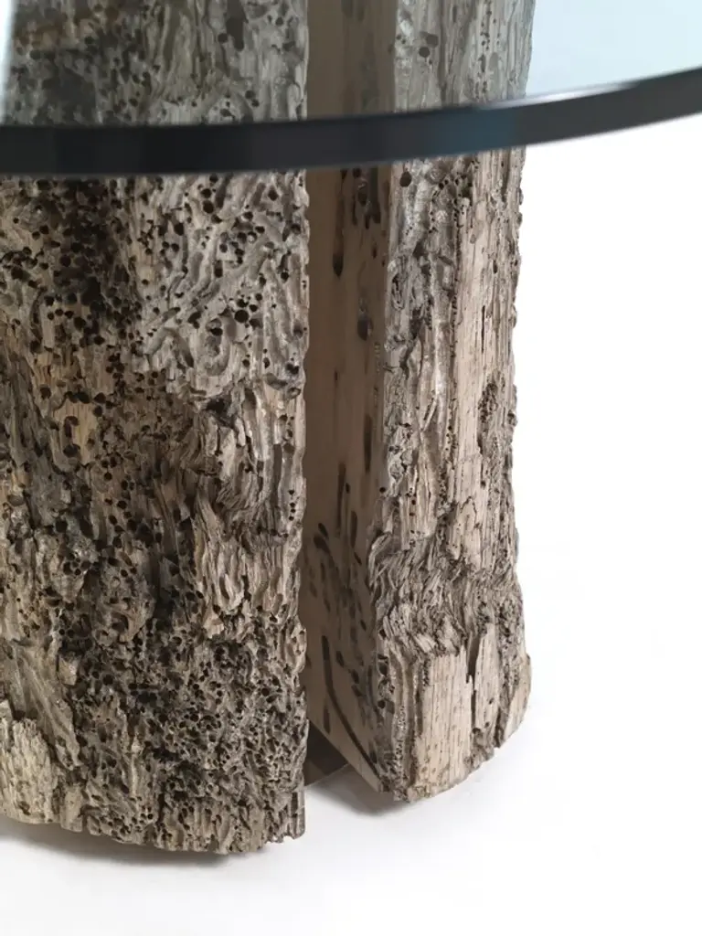 VICE is a round side table with an extra-clear glass top 1.5 cm thick, paired with a leg made of solid Briccola wood.