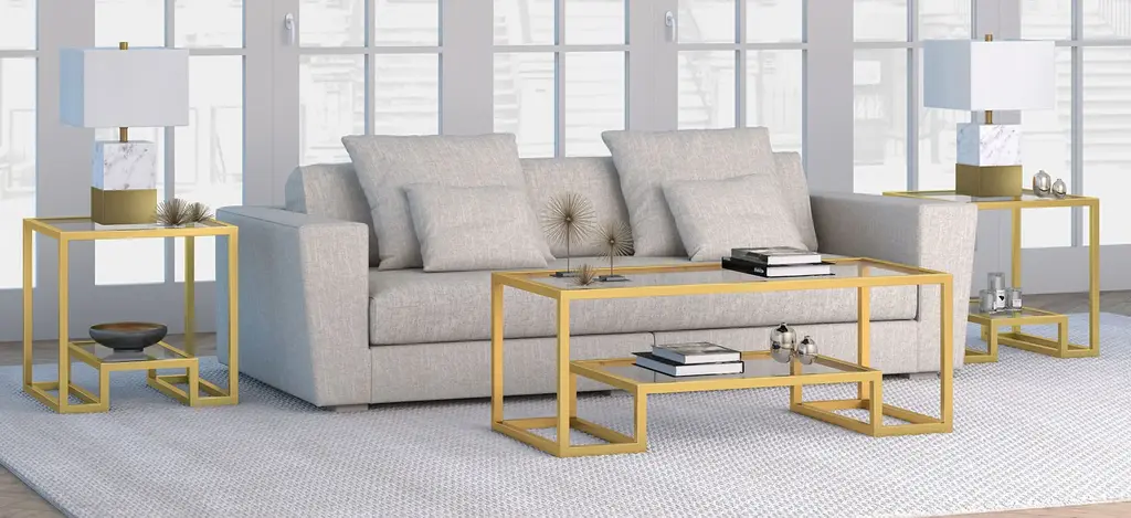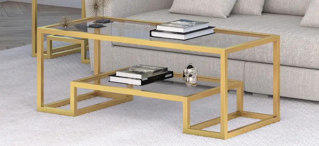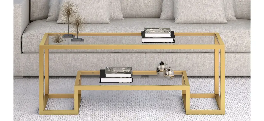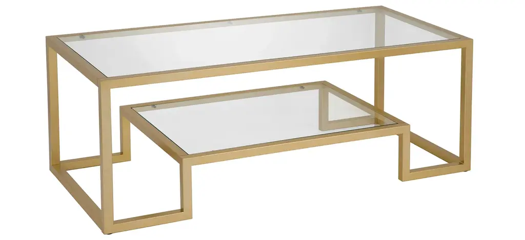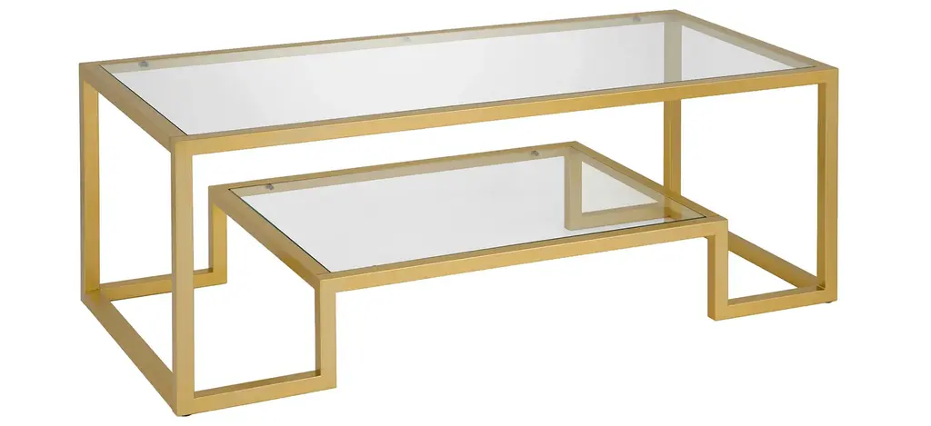 The geometric shapes of this Vicky coffee table add to its Hollywood Regency appeal and overall glam look. Form meets function as the lower shelf is stylishly raised to offer additional shelf space. It seamlessly fits into any room with its glamorous gold finish.
