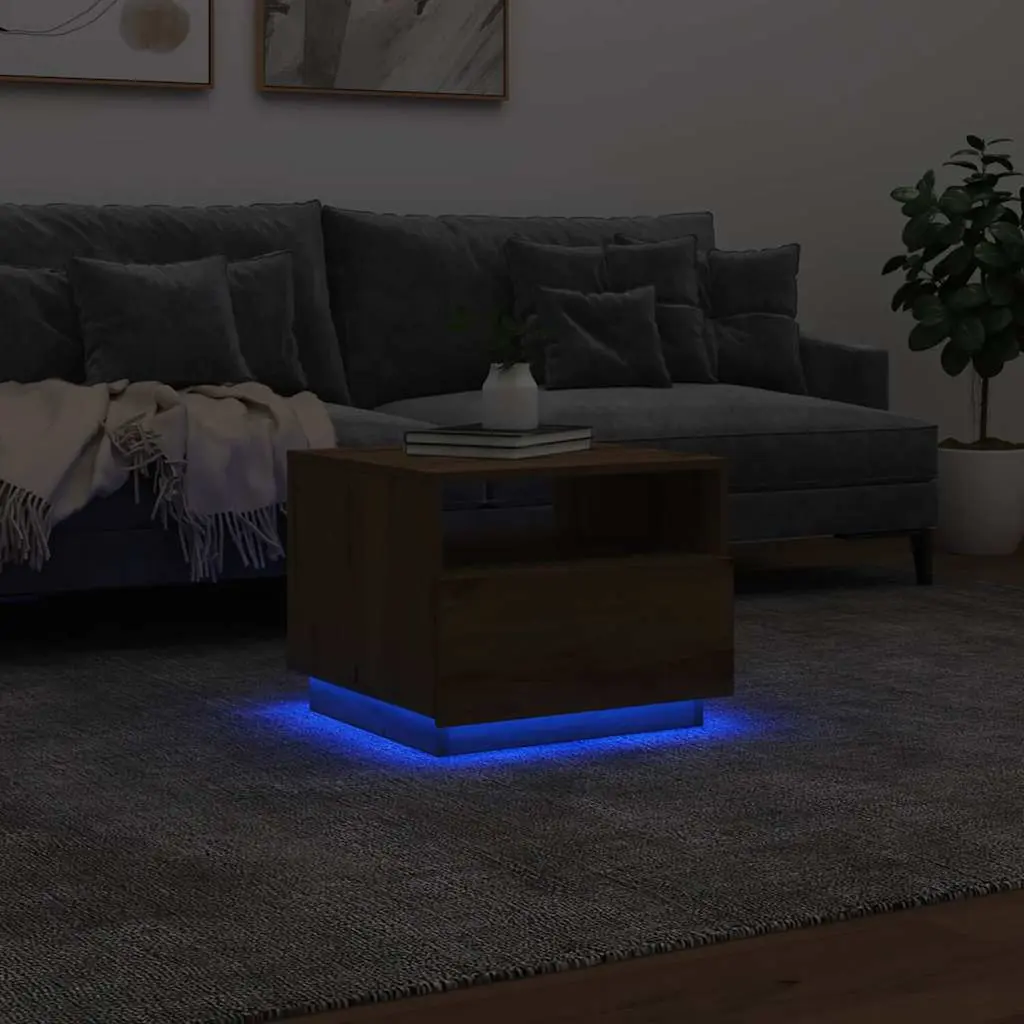 This modern coffee table is a fantastic addition to any living space, mixing style and practicality that will spruce up your living room. With its sleek brown artisan oak finish and a cool built-in LED lighting system, it sets a welcoming vibe perfect for both chilling and entertaining. The built-in RGB LED lights offer customizable lighting options that can enhance your room’s ambiance and make your gatherings livelier. Its modern design with clean lines blends effortlessly into various decors, making it not just a table but a statement piece in your living room. Made from quality engineered wood, this coffee table combines aesthetic appeal with durability, ensuring it withstands the test of time. The compact dimensions of 19.7 x 19.3 x 15.7 in make it a versatile piece that easily integrates into smaller spaces without compromising style. Perfect for serving coffee or as a decorative piece, this table caters to both functionality and the latest home decor trends.