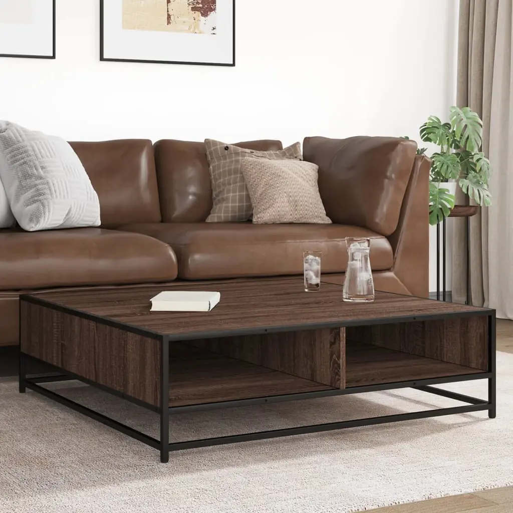 This coffee table mixes the warmth of brown oak with the stylish appeal of black metal, making it a fantastic addition to any living space. Made to meet your coffee-serving needs, it gives off an industrial vibe that enhances the room's feel, creating a cozy and chic atmosphere. Ample Storage: Tons of space for drinks, books, and decor.Durable Design: Made with engineered wood and reinforced metal.Modern Aesthetic: Looks amazing with all kinds of styles.Heat Resistant: Protects against spills from hot drinks.Easy Assembly: Comes with everything you need for setup.