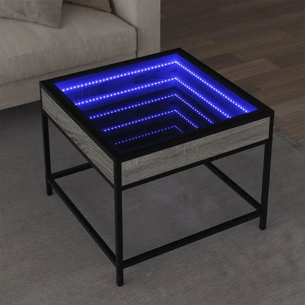 This modern coffee table is designed to brighten up any living room or hallway with its stylish look and clever built-in lighting. Made from high-quality engineered wood, it looks great while providing handy space for coffee or decorative bits, making it an awesome addition to your home. Integrated LED Lighting: The ambient LED strip lights gently illuminate the table, creating a cozy glow that improves your space's feel, ideal for entertaining.Contemporary Design: With its sleek square shape and smooth grey sonoma finish, this coffee table stands out as a modern piece that complements many interior designs, making it a stylish highlight in any area.Versatile Use: Whether it’s serving coffee, as an end table, or side table, this piece blends seamlessly into both living rooms and hallways, providing a chic but practical furnishing solution.Quality Materials: Made from durable engineered wood with glass, this coffee table is built to last and handle daily use, ensuring it keeps its looks and functionality over time.Easy Maintenance: Keeping your coffee table looking great is a breeze—just give it a regular dust down with a soft cloth and wipe clean with a damp cloth to keep it shining.