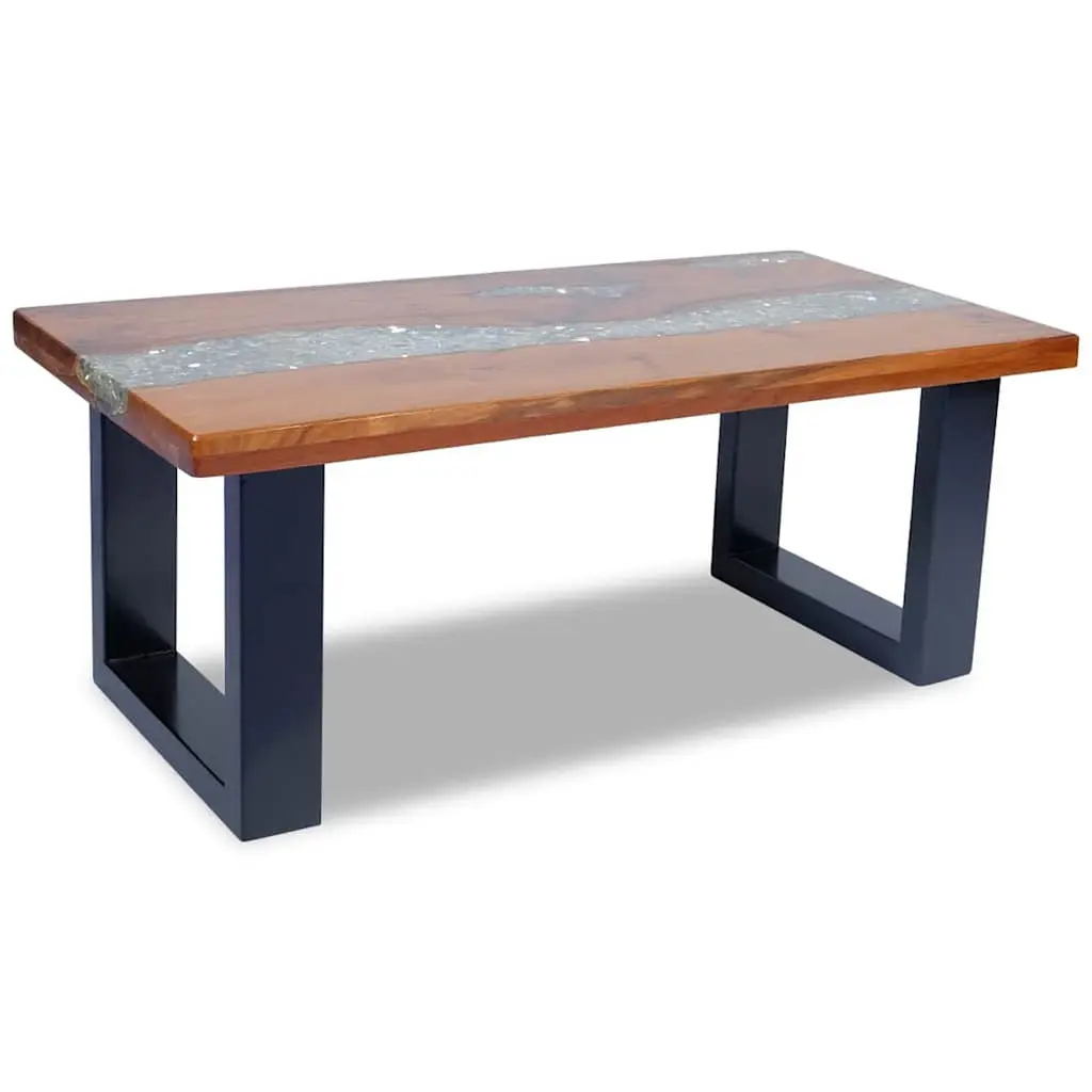 This coffee table is 39.4 in long, 19.7 in wide, and 15.7 in high. It's not just furniture; it makes a style statement. Crafted from solid teak and mango wood with a glossy multicoloured finish, it’s perfect as a centerpiece. The intricate resin decoration gives it depth, making your home warm and inviting, whether you're hosting guests or relaxing with a book. Handcrafted Distinction: Each coffee table is handmade, meaning no two are the same. This makes yours a true original.Robust Material: Built with top-quality solid teak and mango wood, this coffee table is durable and reliable. The wood’s natural beauty and strength make it great for everyday use.Elegant Finish: The lacquered surface provides a shiny look and protects it from wear. This finish not only looks good but also ensures it’s easy to maintain for years to come.Contemporary Style: With its sleek feel and modern design, this coffee table fits right into contemporary decor. It serves as a stylish focal point in your living room.Functional Dimensions: At 39.4 in long and 19.7 in wide, it offers plenty of space for drinks, snacks, and decor without cluttering your area. Standing at 15.7 in, it’s just right for standard sofas or chairs, making it comfy and easy to reach.