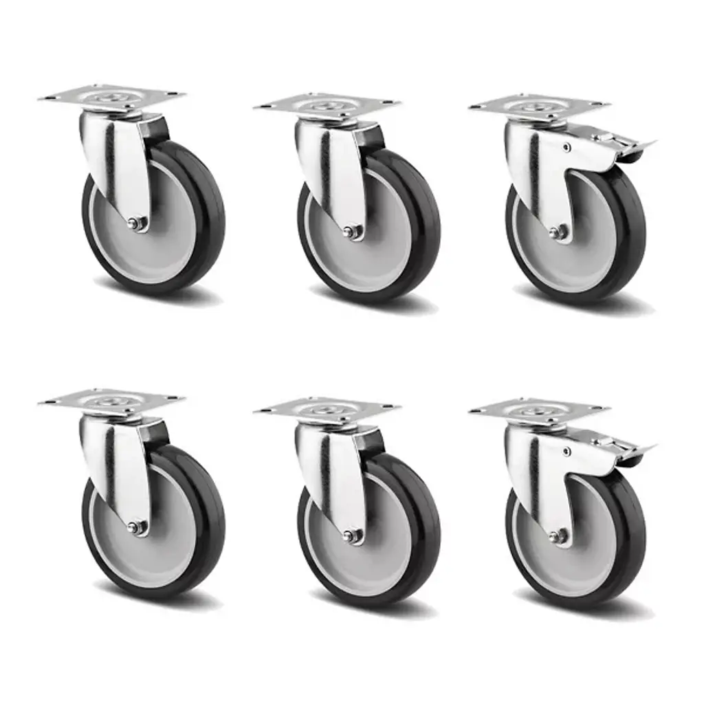 This set of 4 swivel casters with double brakes will be the perfect accessory for small equipment and furniture like workbench, trolley, coffee table, plant stand, bookshelf, shopping cart, etc.These casters are made of TPR (thermoplastic rubber) which is distinguished by a good shock and vibration resistance, enabling these casters to run smoothly and quietly. Additionally, their soft surfaces effectively protect your floor from scratching. Besides, the zinc-coated iron frame adds to the catser's sturdiness and durability. These swivel casters are equipped with double brakes for flexible control. Each caster has a maximum loading capacity of up to 77.2 lb.Delivery includes 4 swivel casters with double brakes.