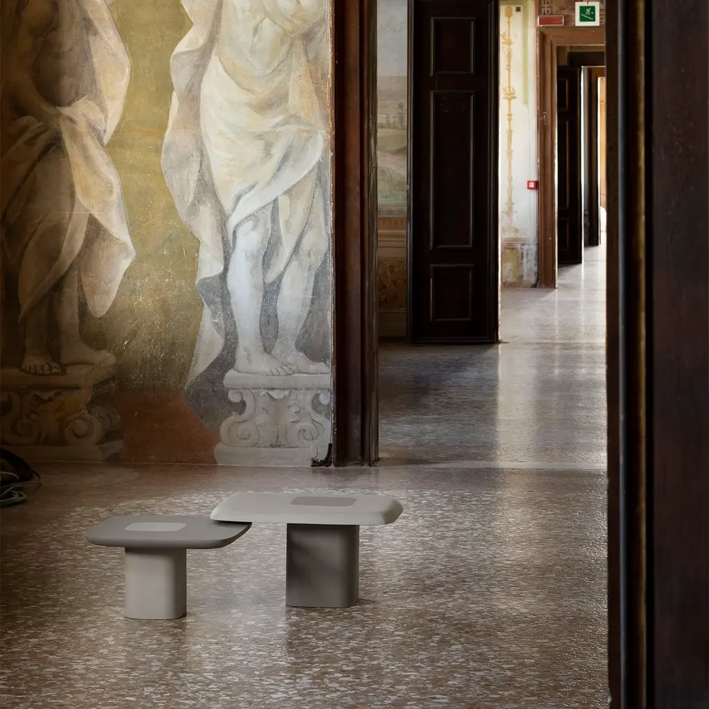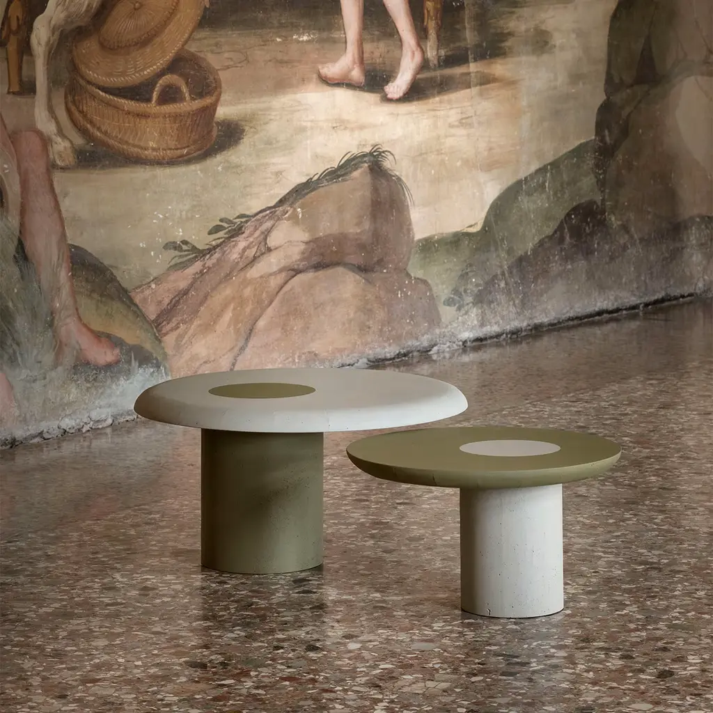 Natural and soft shapes remind of pebbles or small atolls. These objects seem to be smoothed by time and present themselves with a “soft” appearance that dialogues with the delicate tactility of the surface, enriched by the contrast of colors: the tabletop and the – eccentric – heart. Vignole coffee table collection consists of two elements that are at the same time homogeneous and heterogeneous. It is available in a wide range of colors. Please, ask the Concierge for further details.