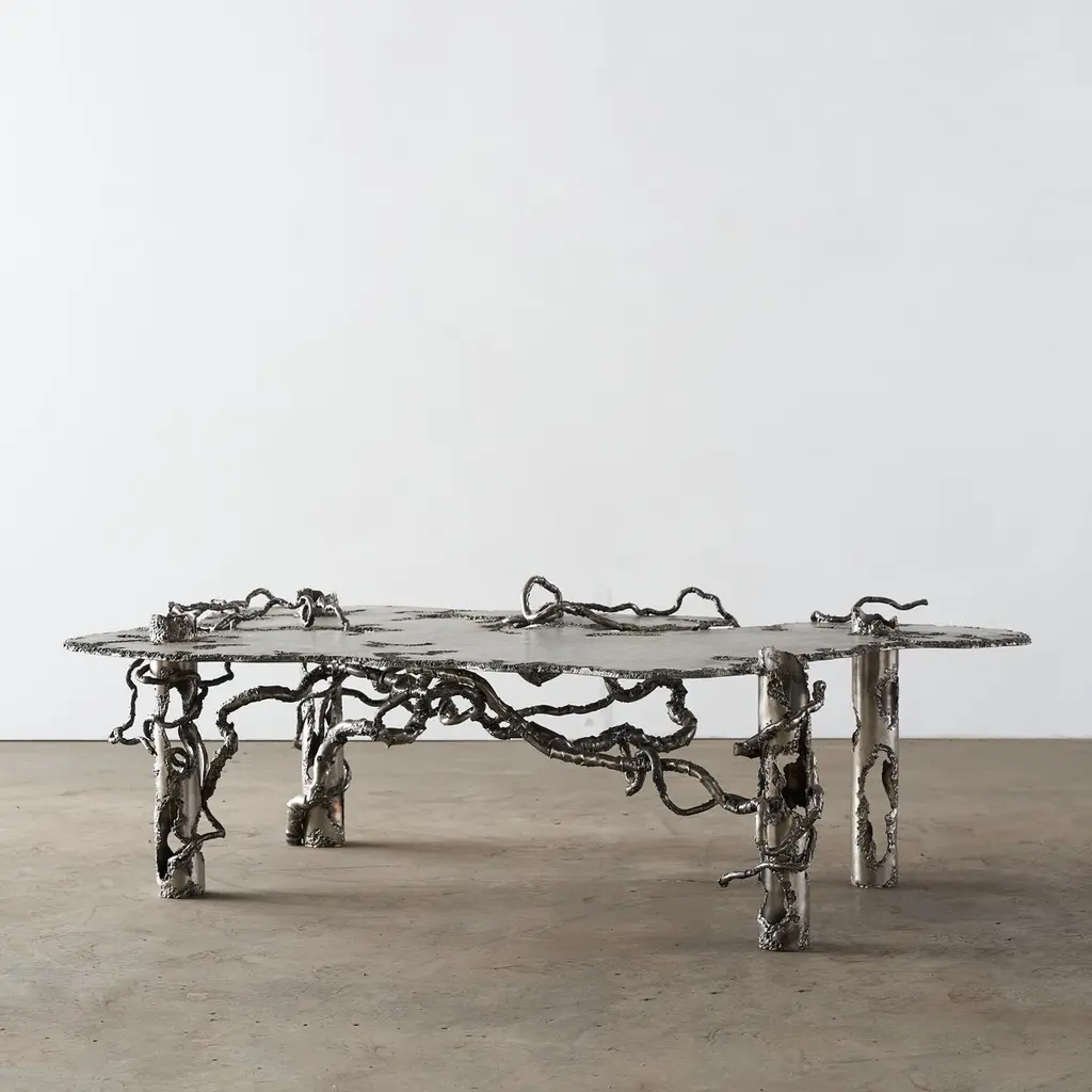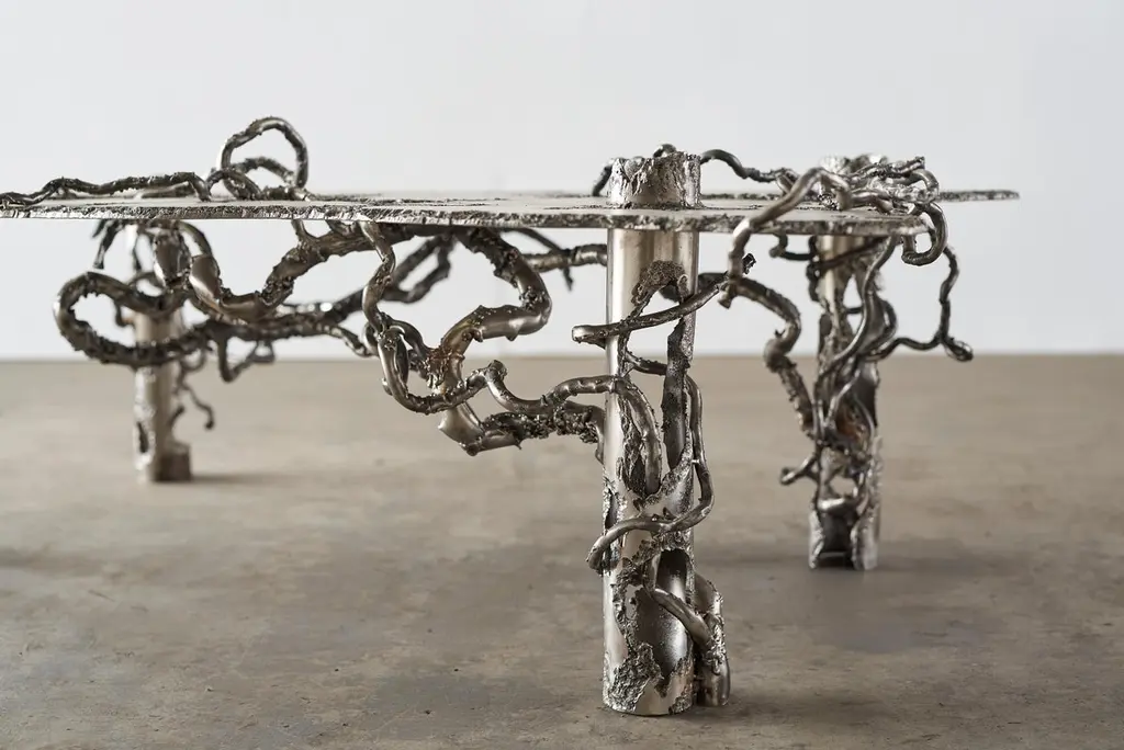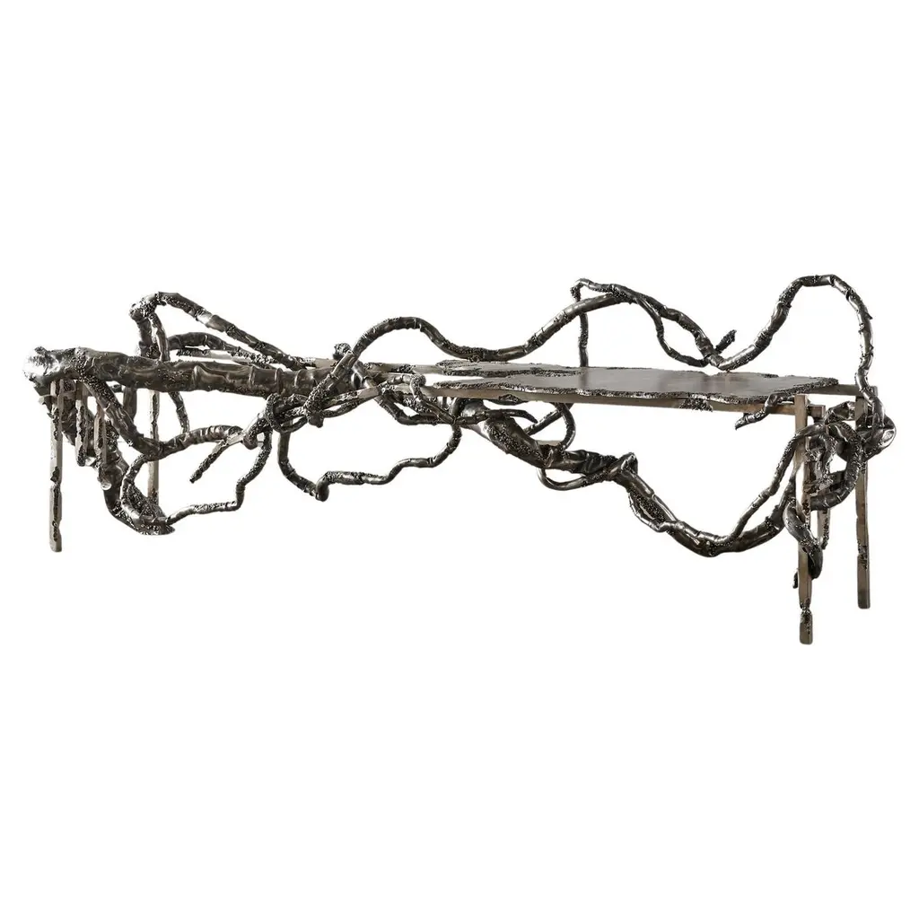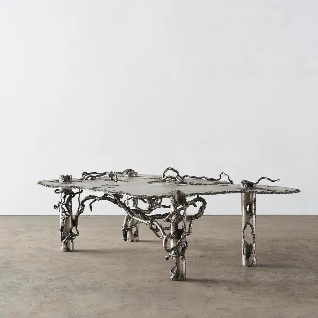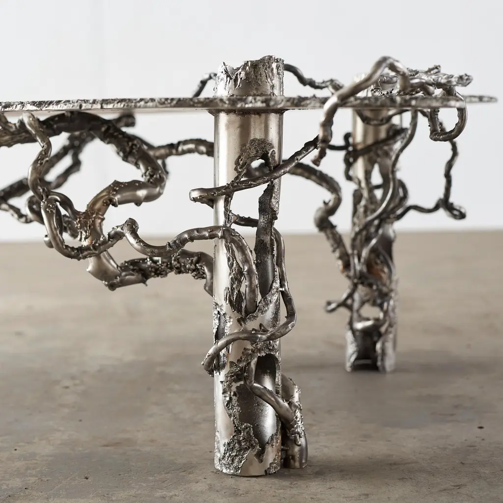 Vines Coffee Table by Michael GittingsOne of a KindDimensions: D 80 x W 110 x H 47 cmMaterials: Stainless steel.Michael GittingsMelbourne based designer Michael Gittings aims to Challenge pre-conceptions around furniture, creating contemporary, yet unconventional pieces.Utilizing industrial processes Gittings welds, weaves, grinds, pours, and grows metal into various functional forms.At the heart of Michael’s work is a desire to expose the raw materials for what they are. Michael’s design ethos shines through in the handmade, unique quality of each piece.Pushing the boundaries of furniture design, Michael’s work balances both artistic and functional sensibilities.