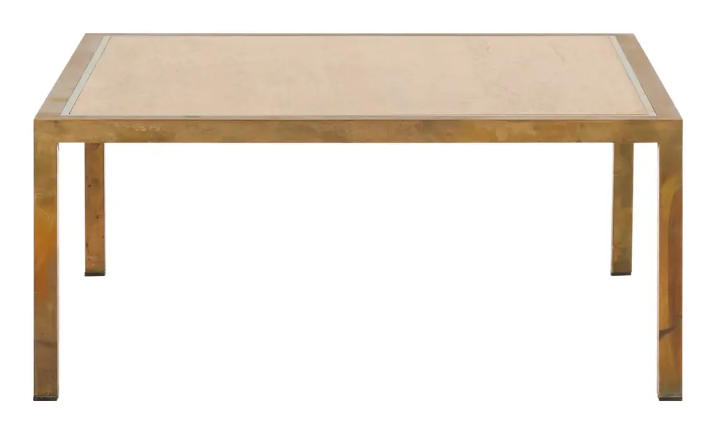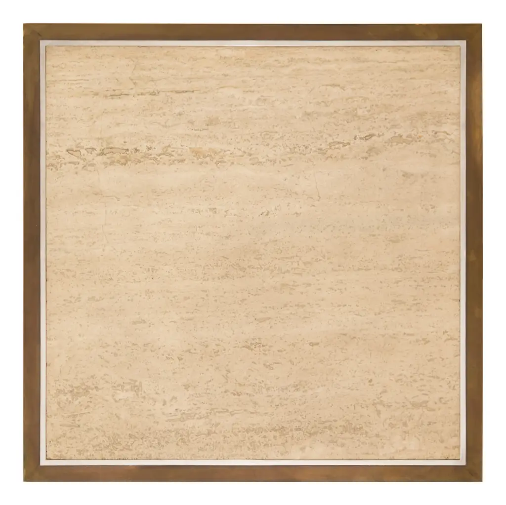 • patinaed brass frame with polished chrome trim •travertine stone top •mid 20th century •france Dimensions• 31.5"W x 31.5"D x 14.25"H