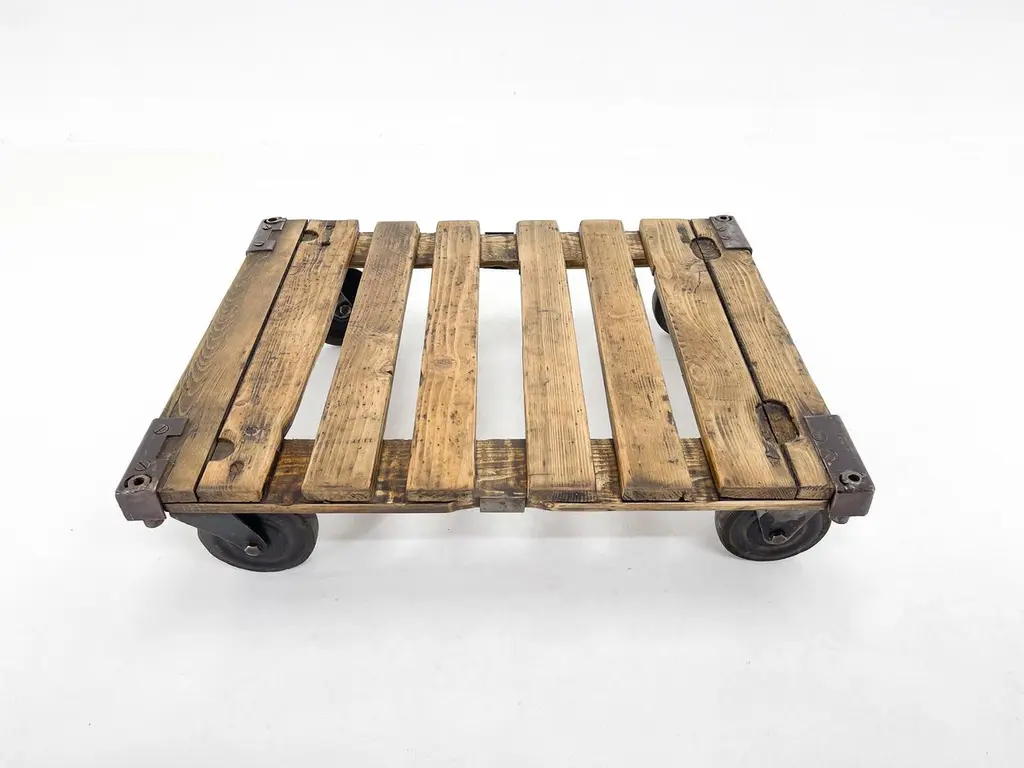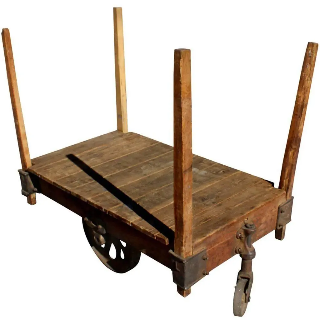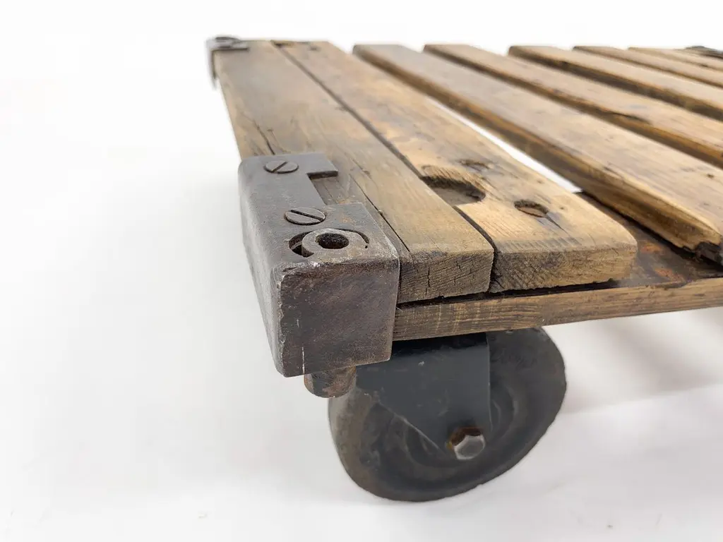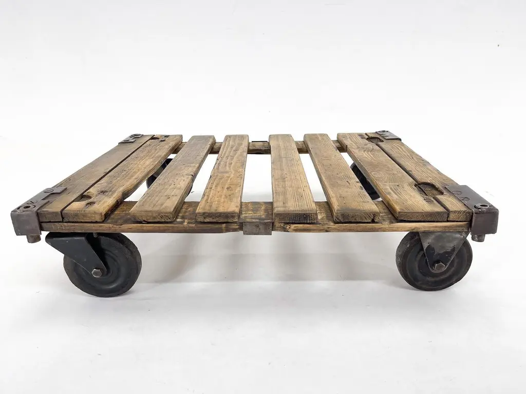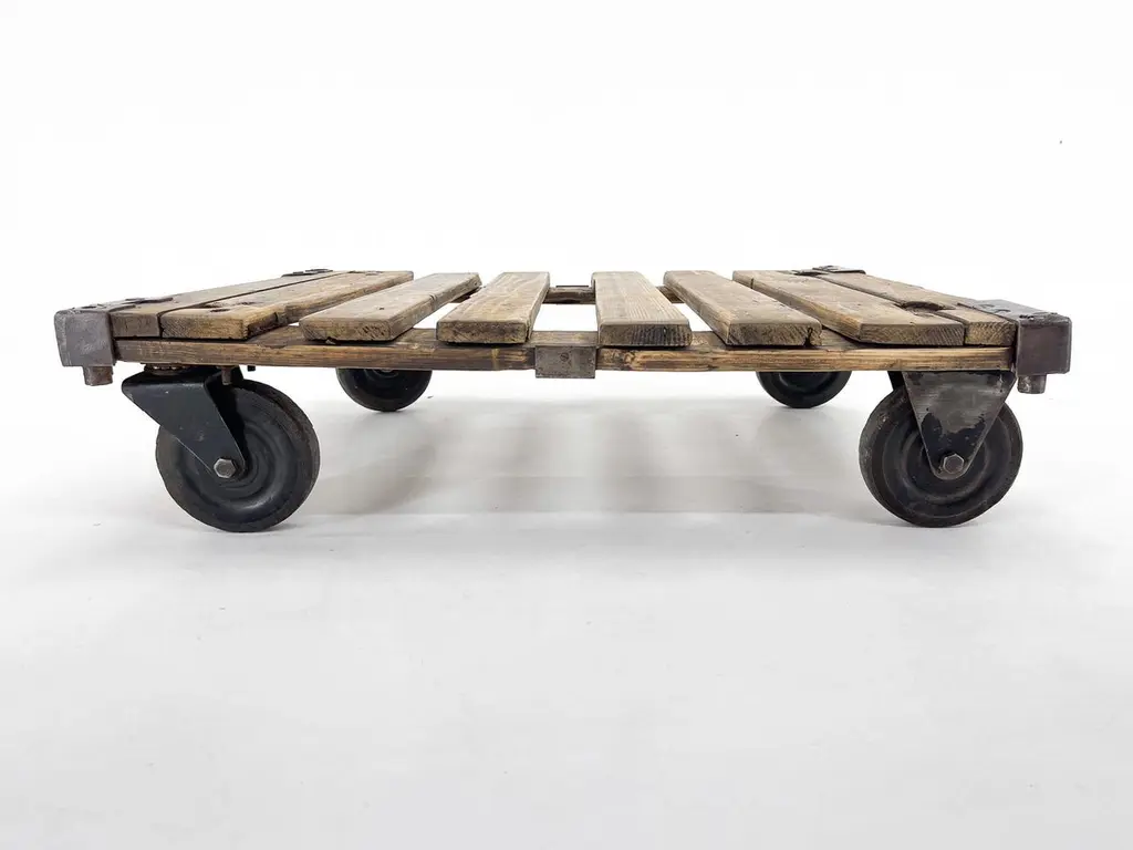 Vintage Industrial Iron & Wood Coffee Table On Wheels