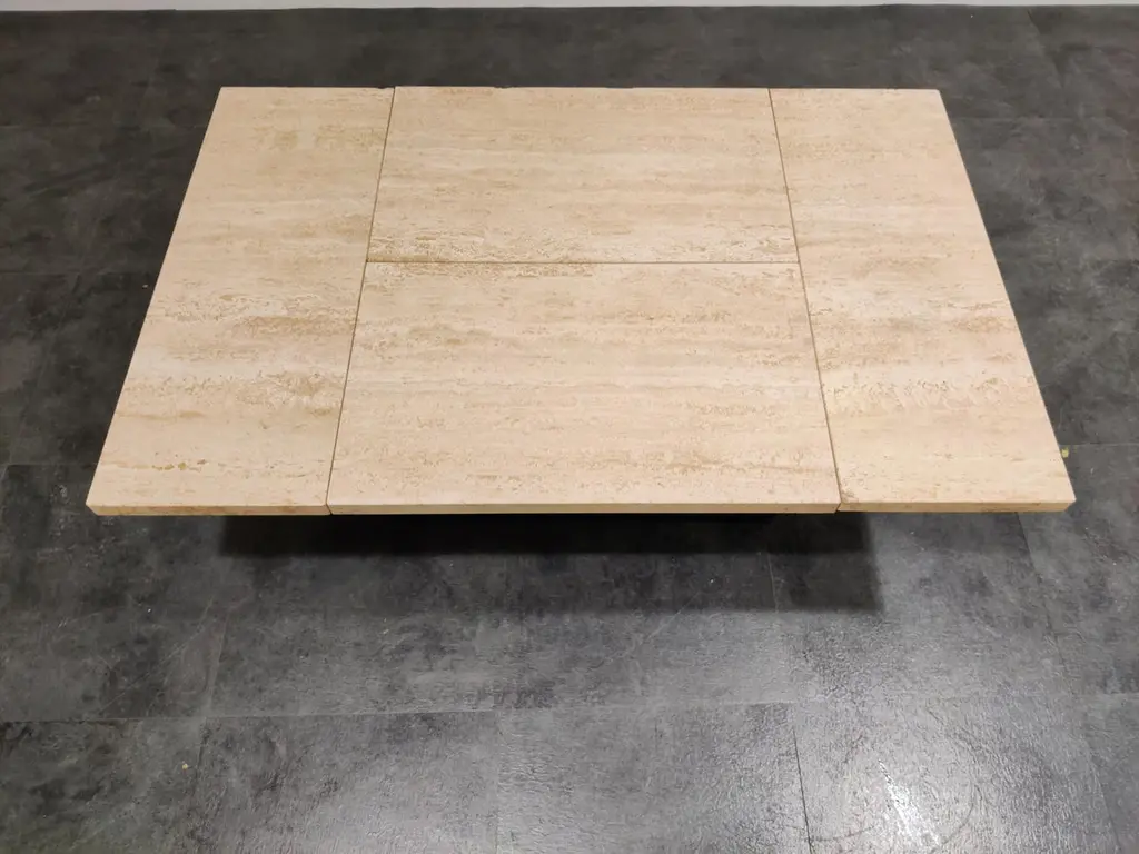 Vintage travertine hidden bar coffee table.With the top closed it looks like a regular coffee table, but open it up and it reveals a mirrored storage space for glasses and bottles.A great coffee table to add some 1970s glamour period Ambience.This one has one small repair to the cornes.Mirrored glass base, travertine stone top.Good condition.1970s, BelgiumDimensions:Height 43cm/16.92"Open Length 120cm/47.24depth 95cm/37.40"ClosedLength 125cm/49.21"Depth 80cm/31.49".