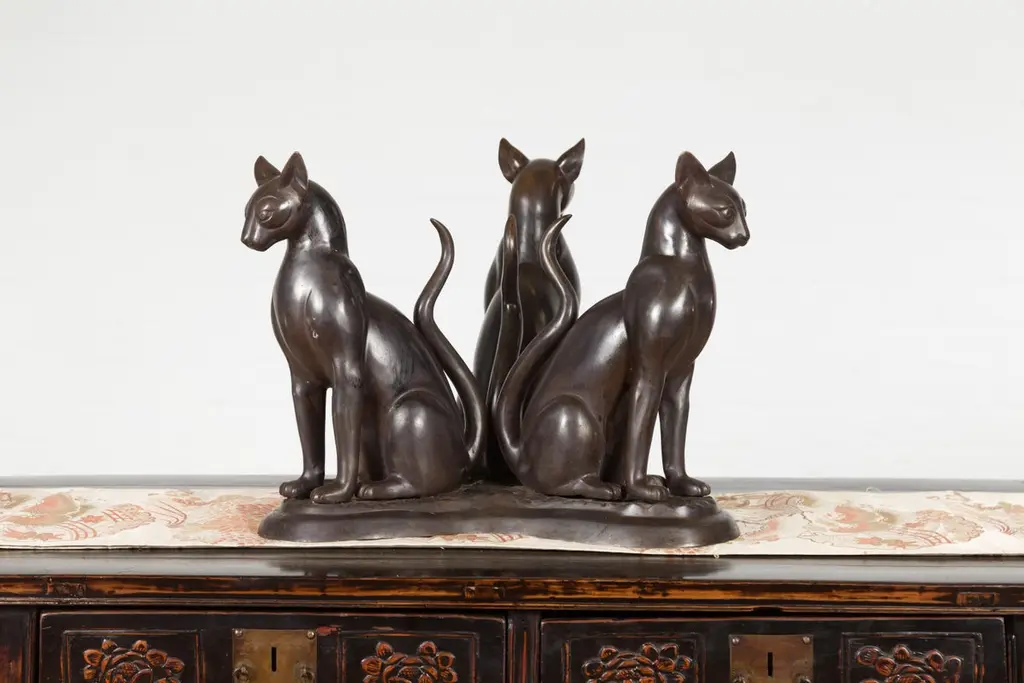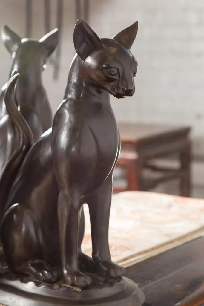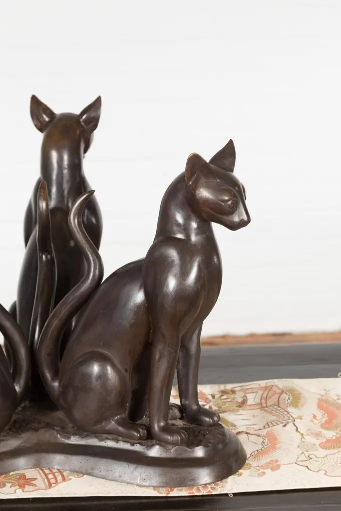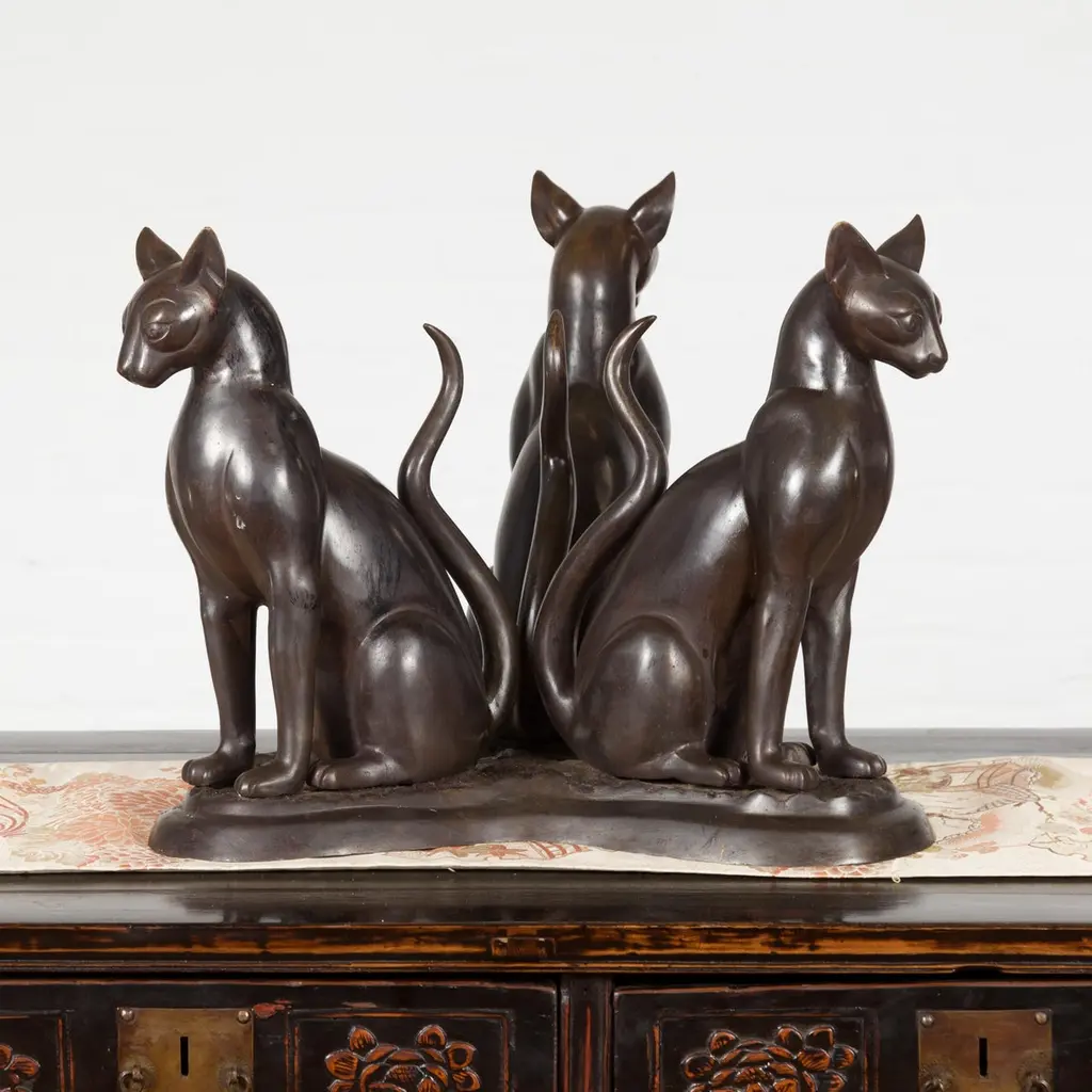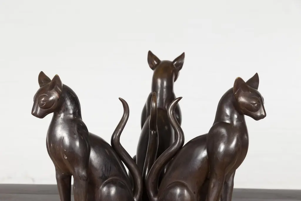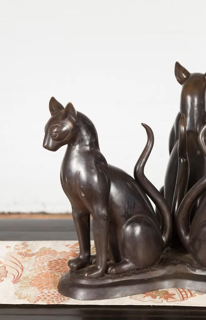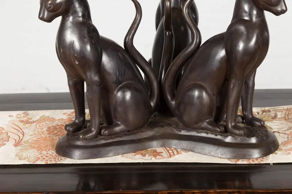A vintage triple cat lost wax cast bronze coffee table base from the mid 20th century. We currently have two tables available, priced and sold $2,500 each. Created with the traditional technique of the lost-wax (à la cire Perdue) which allows for great precision and finesse in the details, this coffee table base attracts our attention with its three dignified cats sitting on a tripartite base. Facing away from one another, they exude an undeniable air of calm. Boasting a dark patina, this vintage triple cat bronze coffee table base will make for an excellent addition to any living room, covered patio or garden!