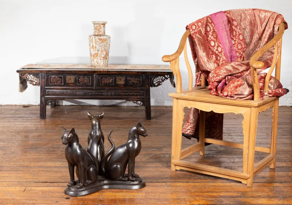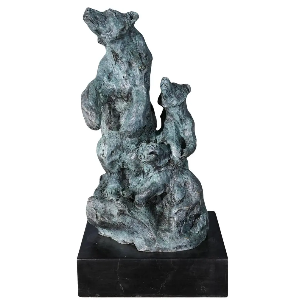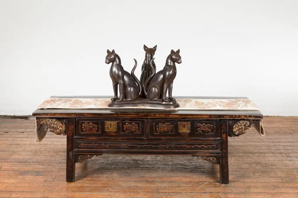 Vintage Triple Cat Lost Wax Cast Bronze Coffee Table Base With Dark Patina