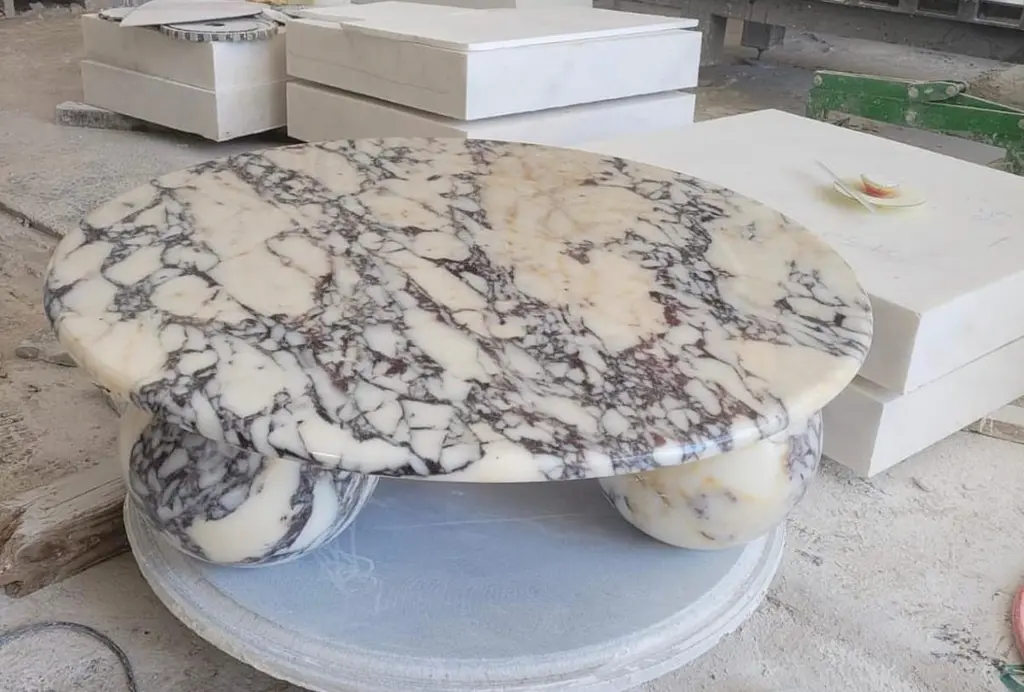 Crafted from a single material, this coffee table features a 3 cm thick bullnose-edged top, supported by three sculpted, spherical legs. The balls can be positioned freely, allowing you to customise the table’s look while ensuring the top remains securely balanced by its own weight.After years of sourcing premium-quality stones and collaborating with skilled artisans, we now offer a curated selection of unique stone options for various table designs. The pictured table is made from our Violet Veined Marble, characterised by a soft white base, subtle beige accents, and striking violet and dark veining. Available stone options:• Travertine• Filled Travertine• Silver Travertine• Hazelnut Travertine• Red Travertine• White Marble (subtle grey veining)• Black Marble (subtle white veining)• Emperador Marble• Viola Veined Marble• Rosso Marble