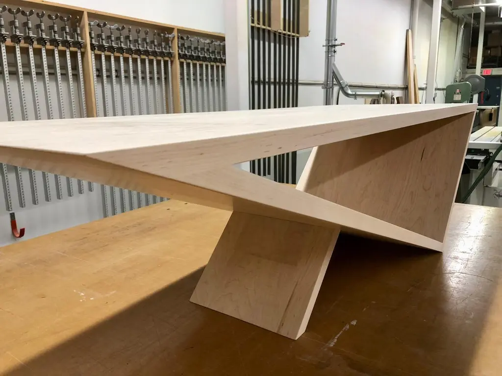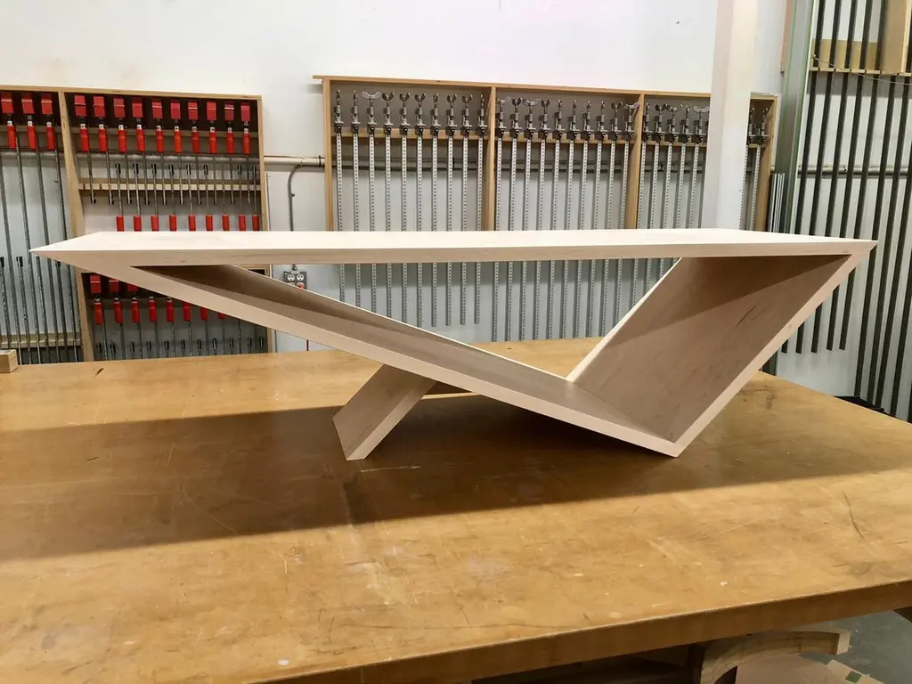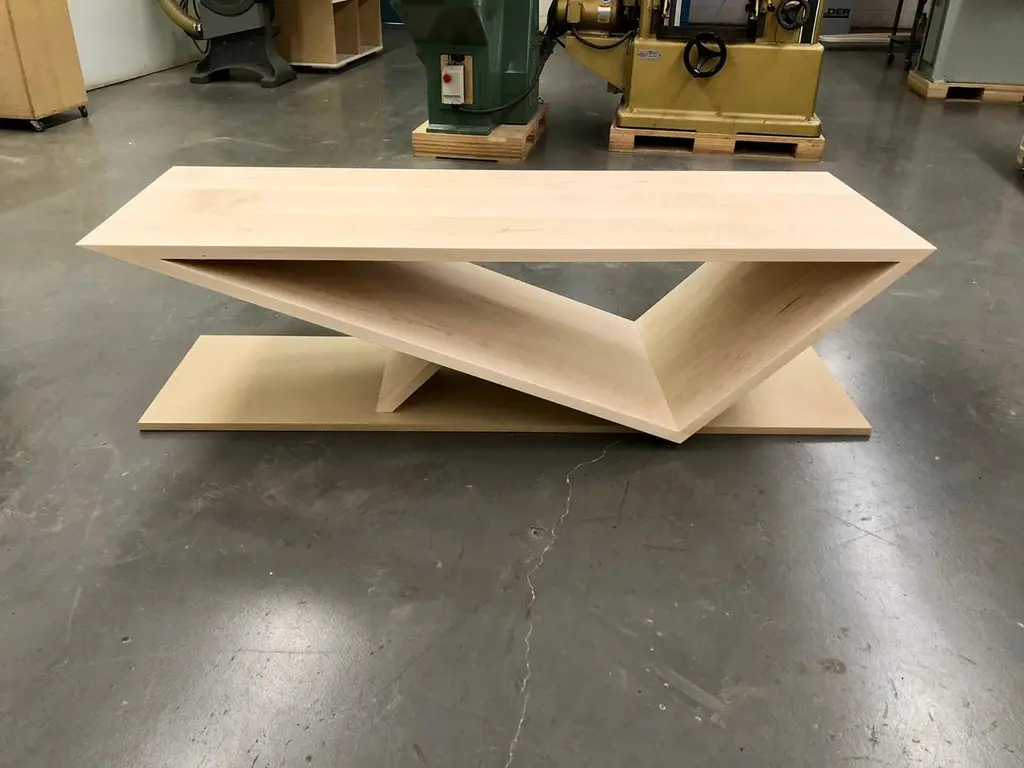 In this vast, mysterious universe we are but a fleeting moment.A brief flicker in the infinite flame.Time and space- dancing together in a cosmic waltz. An eternal rhythm of the universe.The inspiration for the Viva Table collection comes from the power, simplicity, and elegance of the triangle.This is an ongoing series exploring the dynamics of balance, weight, gravity, mass, and how this dynamic is expressed utilizing various materials.A powerful Minimalist gem with a dynamic presence. This deep, rich maple coffee table has an oiled finish.Available in other other hardwoods.Dimensions:66” long x 25” wide x 18” high. –size modifications availableNew and made to order. Lead time is 12-16 weeks. Signed and dated on underside.