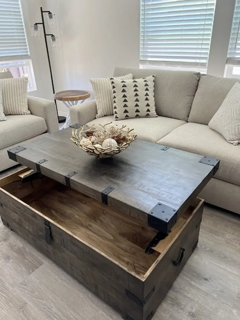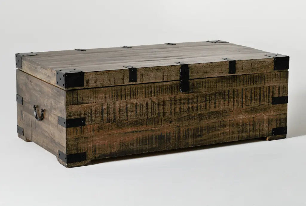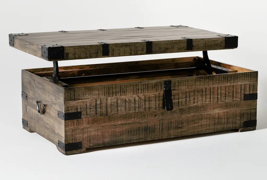 The Wally Brown 52" Wide Rectangle Wood Lift-Top Trunk Coffee Table offers functional storage and a versatile design for your living room. Crafted from solid mango wood, this industrial-style coffee table features a lift-top for easy access to its spacious storage compartment. Perfect for keeping your living space organized and clutter-free.