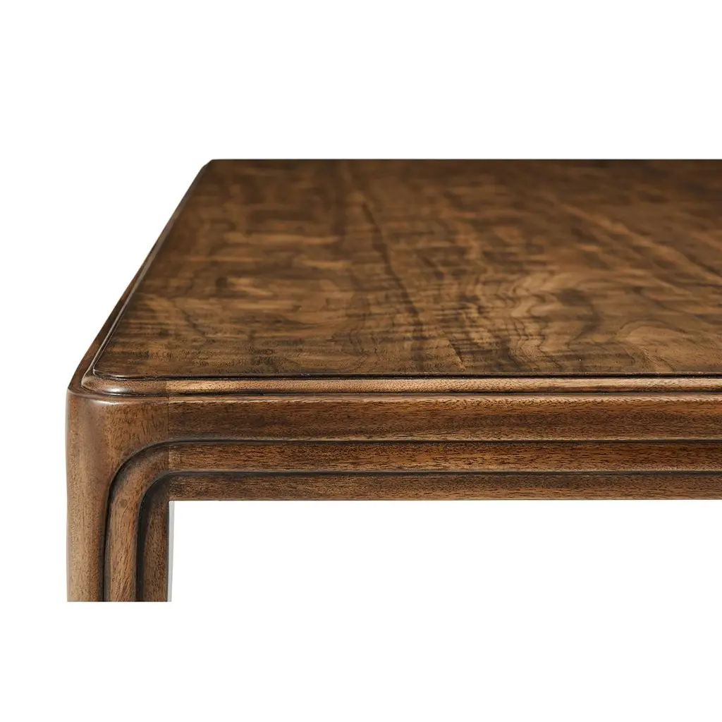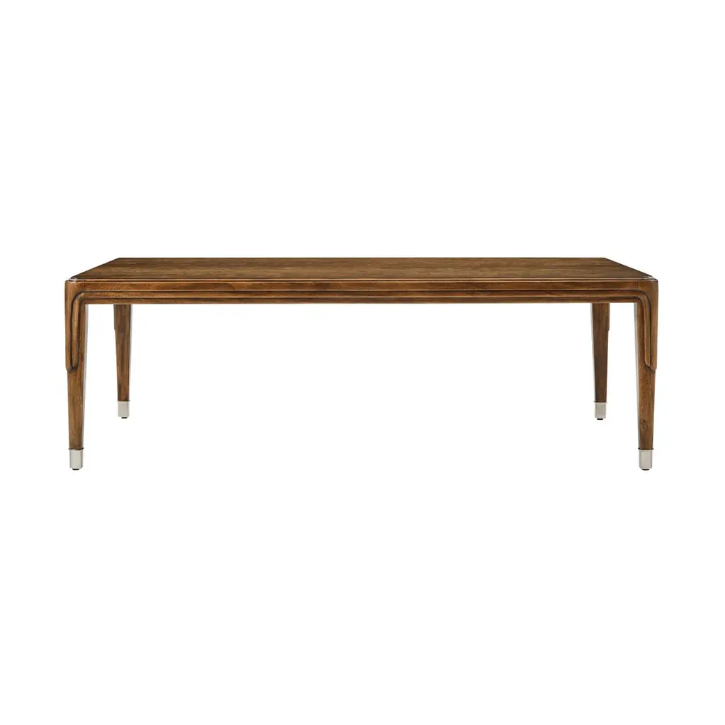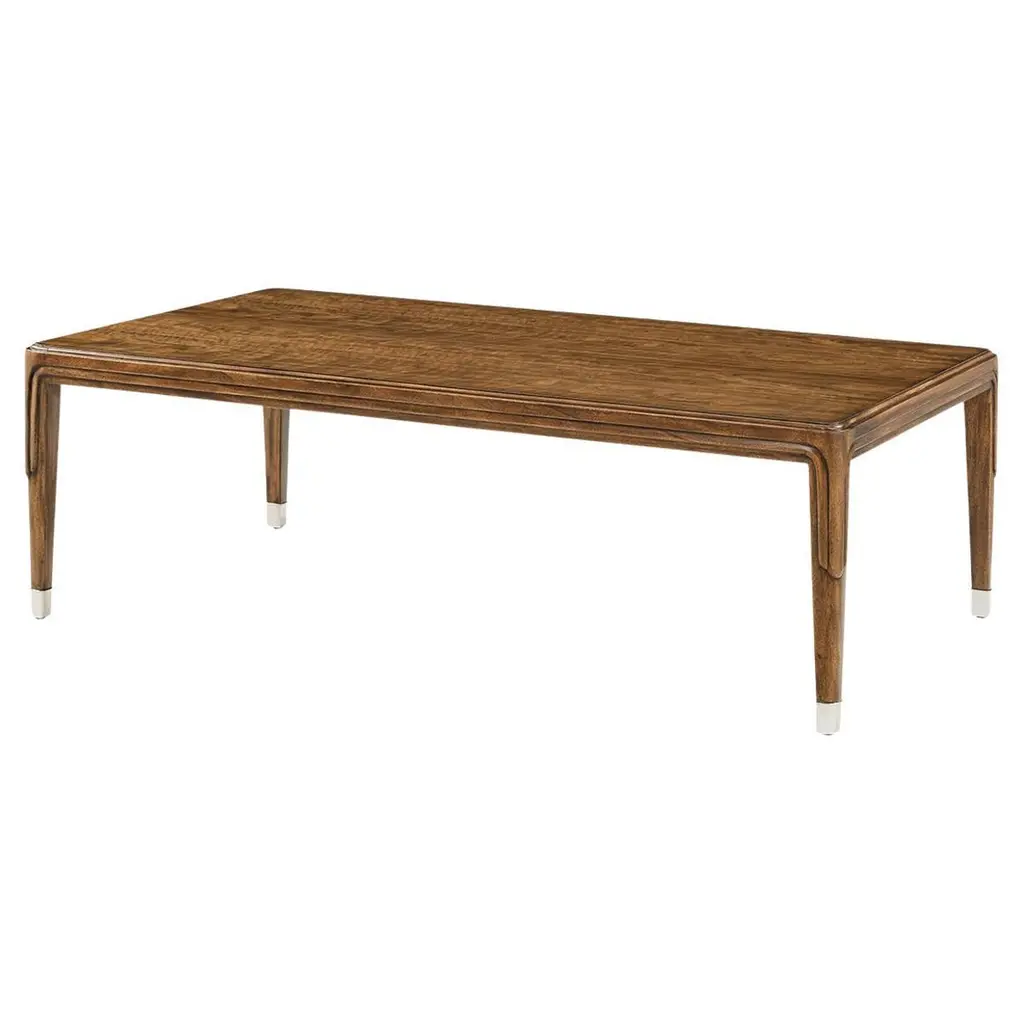 Showcasing a refined silhouette with tapered legs and subtle inset detailing, this table exudes early 20th-century elegance. The warm wood grain enhances its luxurious appeal, while nickel-capped feet add a modern touch, blending Art Deco charm with contemporary refinement.Designed to elevate any living space, this coffee table is both a statement piece and a functional centerpiece. Its exquisite craftsmanship makes it perfect for traditional and modern interiors alike, offering a balance of artistry and practicality.Dimensions: 54" W x 32" D x 17½" H
