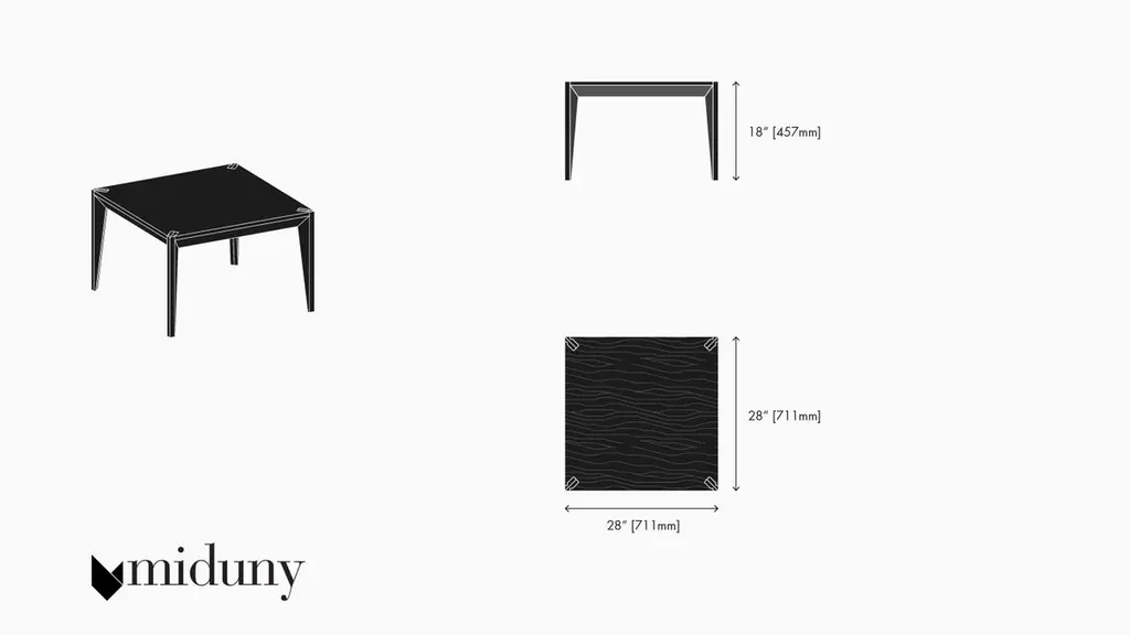 Merging clean lines with warm materials, the faceted geometry of the MiMi square coffee table creates a slender, elegant profile punctuated with painted surfaces that capture light. This handcrafted modern and graceful design looks great from all angles. The MiMi line was an NYCxDesign 2018 Honoree and German Design Award 2019 Nominee.Designed in Brooklyn by Italian-born architect Ale Preda for Miduny, this artisanal product is made in Italy by master craftsmen with sustainable, FSC (forestry stewardship council) certified materials. . The MiMi square coffee table walnut black model features a solid 13-ply furniture-grade birch plywood structure, black walnut veneer top, grey-black painted finish at the facets (RAL 7021), and is coated with a 20% gloss finish.Each MiMi table is hand-stamped with a unique serial number (on the underside) and comes with a signed certificate of authenticity. Like all our products, this item is efficiently packed for flat shipping inside a custom box and minimal assembly is required. Our custom joinery system allows legs to be pressure fitted in the notched top and secured with two bolts. Assembly takes a few minutes.