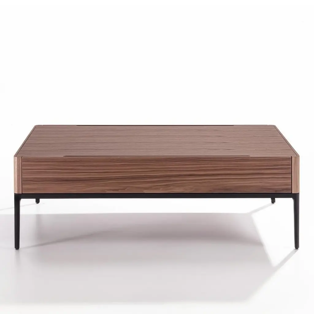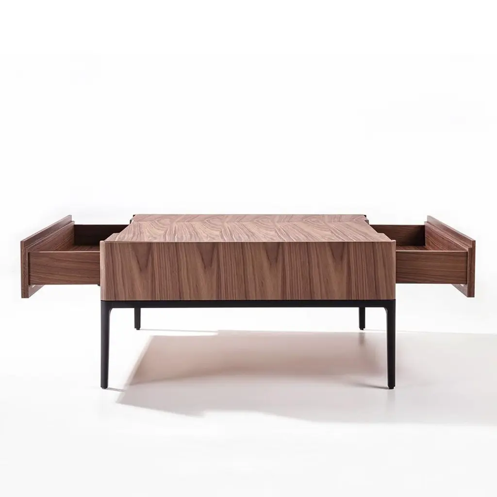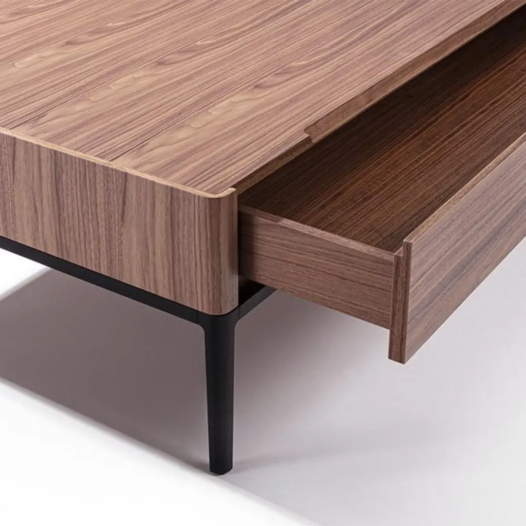 Coffee table walnut case with black lacquered aluminium base and with solid walnut top with 2 drawers.