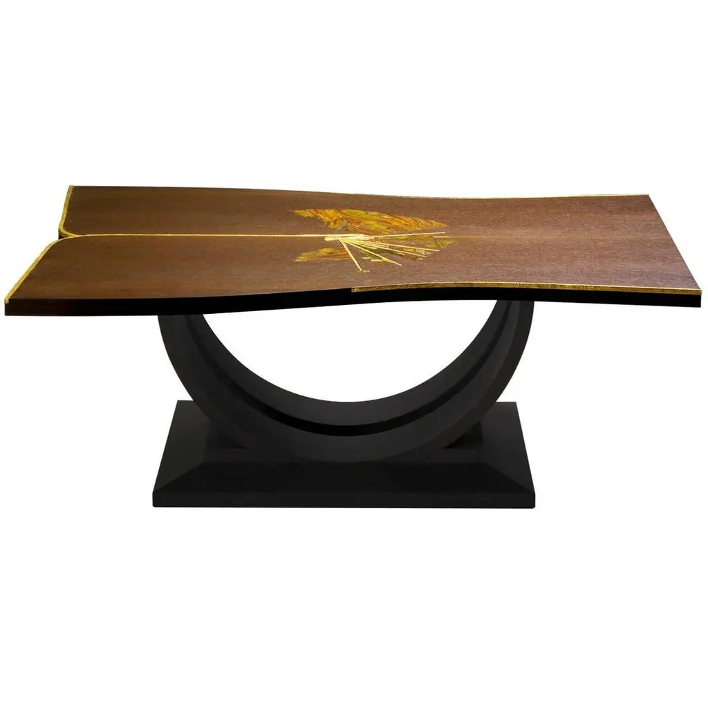 Walnut Coffee Table With Handcrafted Brass Inlay And Black Lacquered Legs