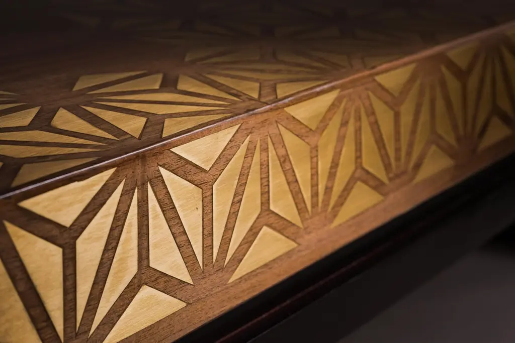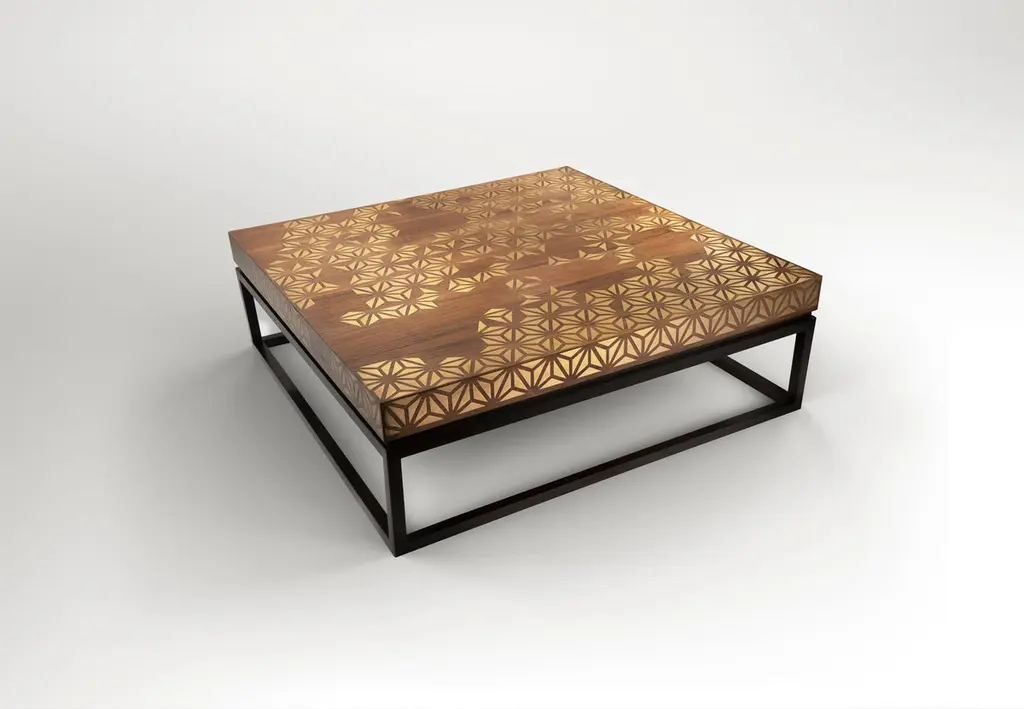 Walnut Coffee Table with Handcrafted Brass Inlay and Black Lacquered Legs. Perfection is one of our signature tables where many textures are charmingly infused to make this table a design showpiece. It is made from massive walnut wood infused with a geometric brass inlay and black lacquered legs. Its square dimension truly makes it a center piece and suitable for many furniture layouts.