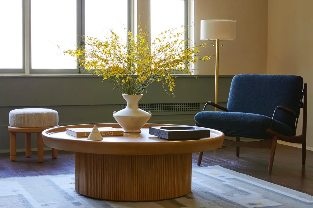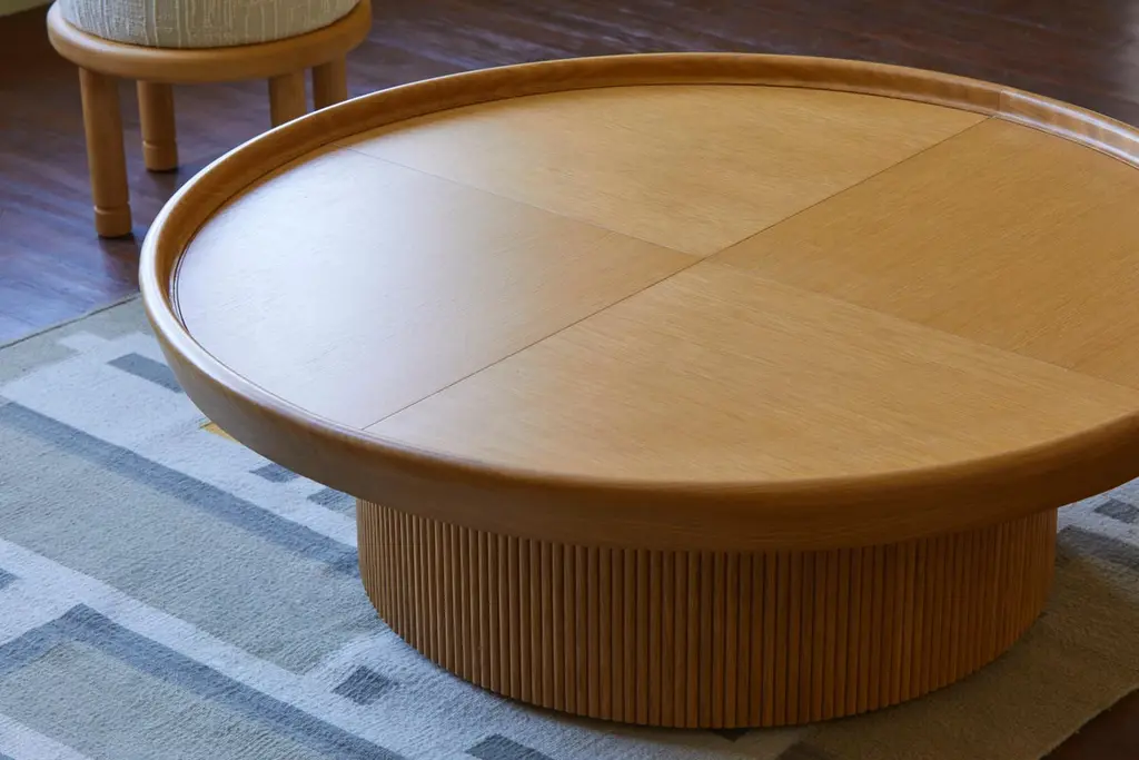Walnut Ojai coffee table by Lawson-Fenning. The Ojai coffee table features a round top with marquetry and a drum-shaped base with tambour details. Available in American walnut or white oak. The Lawson-Fenning Collection is designed and hand made in Los Angeles, California. Reach out to discover what options are currently in stock.