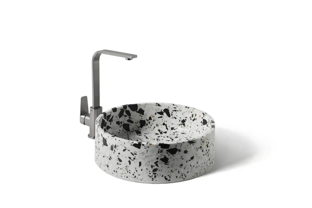 'HUI' is a wash basin / vessel sink made of terrazzoby Bentu designTerrazzo colors: white, black, red, sky blue, green mintDimensions: H 13cm - D 40.8cmThe basin comes with a drainer. Bentu Design's furniture derives its uniqueness from the simplicity of its forms and its materials. Designed and manufactured by the designers of Studio Bentu themselves, these lamps, coffee tables, cup-boards and seats all have in common the use of concrete. This material that is usually reserved for construction use, finds here a certain nobility. The patterns that are created by the grains of this material once it flowed and unmolded is what gives the creations of Studio Bentu their originality. Accompanied at times finishing’s that are more valuable like marble or polished brass, making concrete a more suitable material for furniture.BENTU Design Studio was founded in 2012 as an independent design brand. They engage in product design and innovation. With a basic method of design, they are committed to make different materials return to their essence, present their unique texture and produce the products that suit our daily demand.