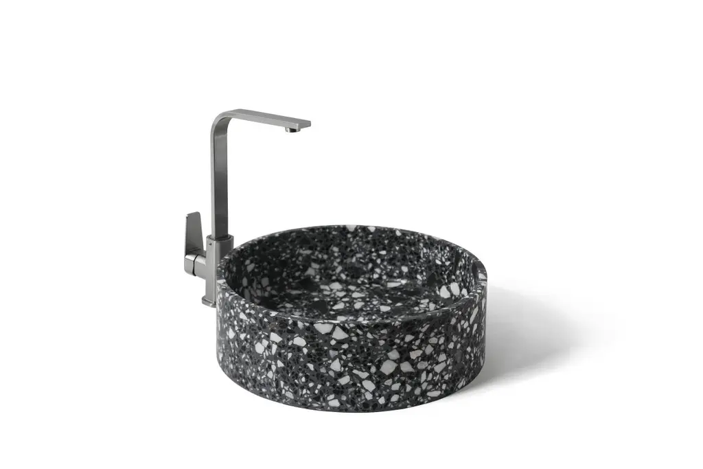 'HUI' is a wash basin / vessel sink made of terrazzoby Bentu designTerrazzo colors: white, black, red, sky blue, green mintDimensions: H 13cm - D 40.8cmThe basin comes with a drainer. Bentu Design's furniture derives its uniqueness from the simplicity of its forms and its materials. Designed and manufactured by the designers of Studio Bentu themselves, these lamps, coffee tables, cup-boards and seats all have in common the use of concrete. This material that is usually reserved for construction use, finds here a certain nobility. The patterns that are created by the grains of this material once it flowed and unmolded is what gives the creations of Studio Bentu their originality. Accompanied at times finishing’s that are more valuable like marble or polished brass, making concrete a more suitable material for furniture.BENTU Design Studio was founded in 2012 as an independent design brand. They engage in product design and innovation. With a basic method of design, they are committed to make different materials return to their essence, present their unique texture and produce the products that suit our daily demand.
